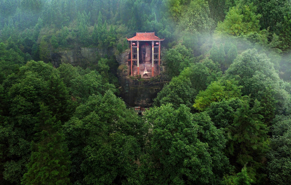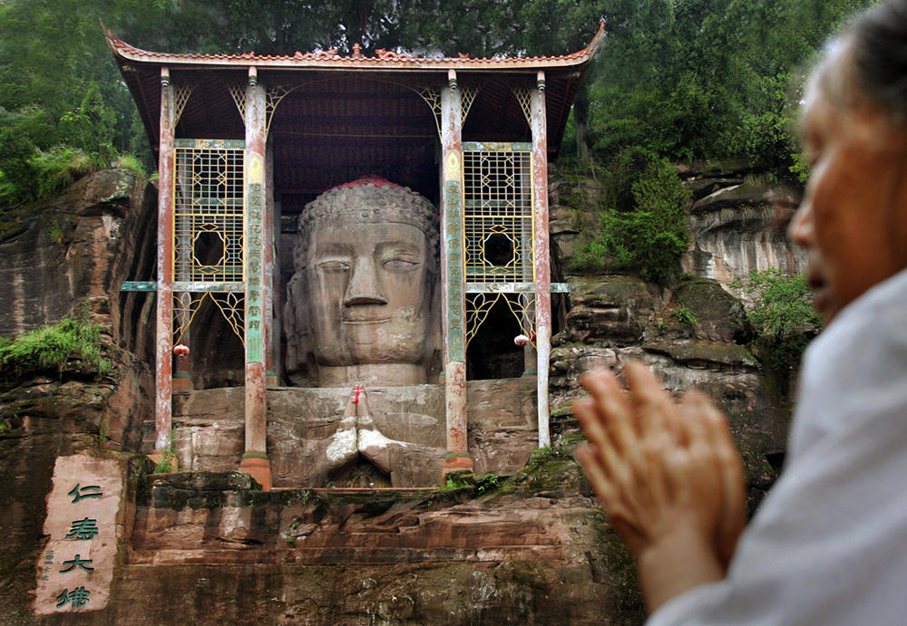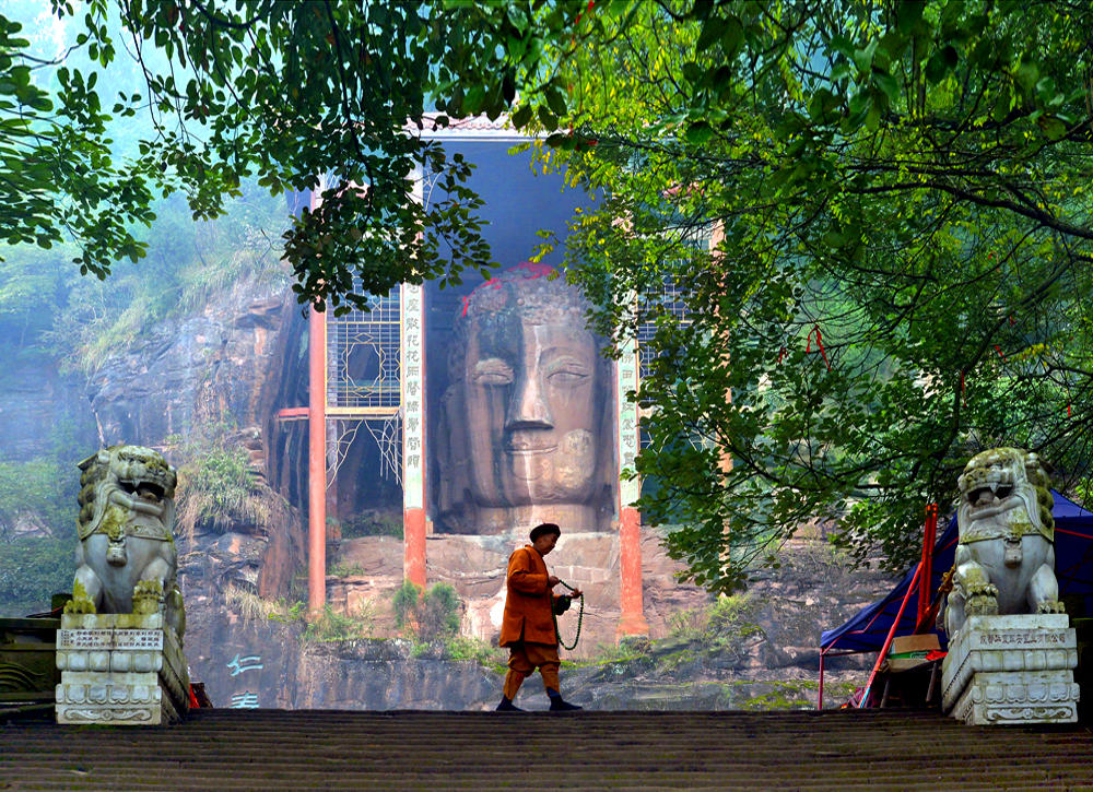 这里是龙泉山脉的尾部,海拔760米高的鹰头村,牛角寨是村中最高的山峰,仁寿大佛依山而造,与山齐高。这尊有着“中华第一胸佛”之称的弥勒佛半身石刻像,高15.85米,宽11米,建成于公元707年,迄今已有1300多年。 (来自:朱建国)