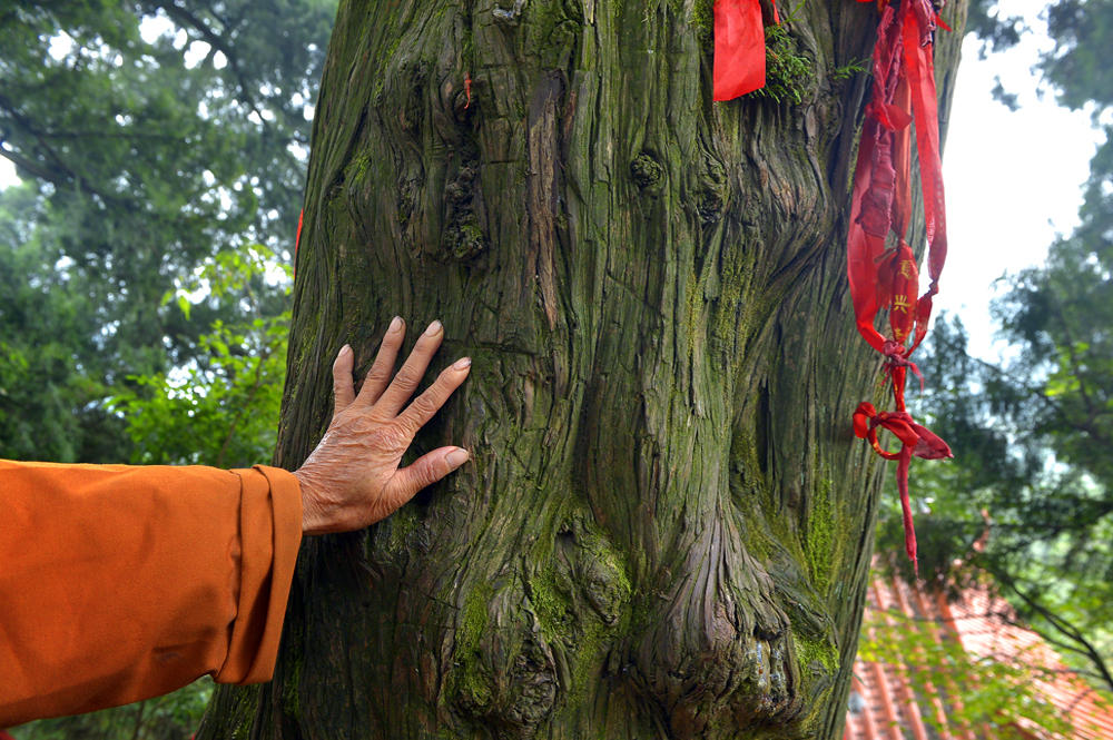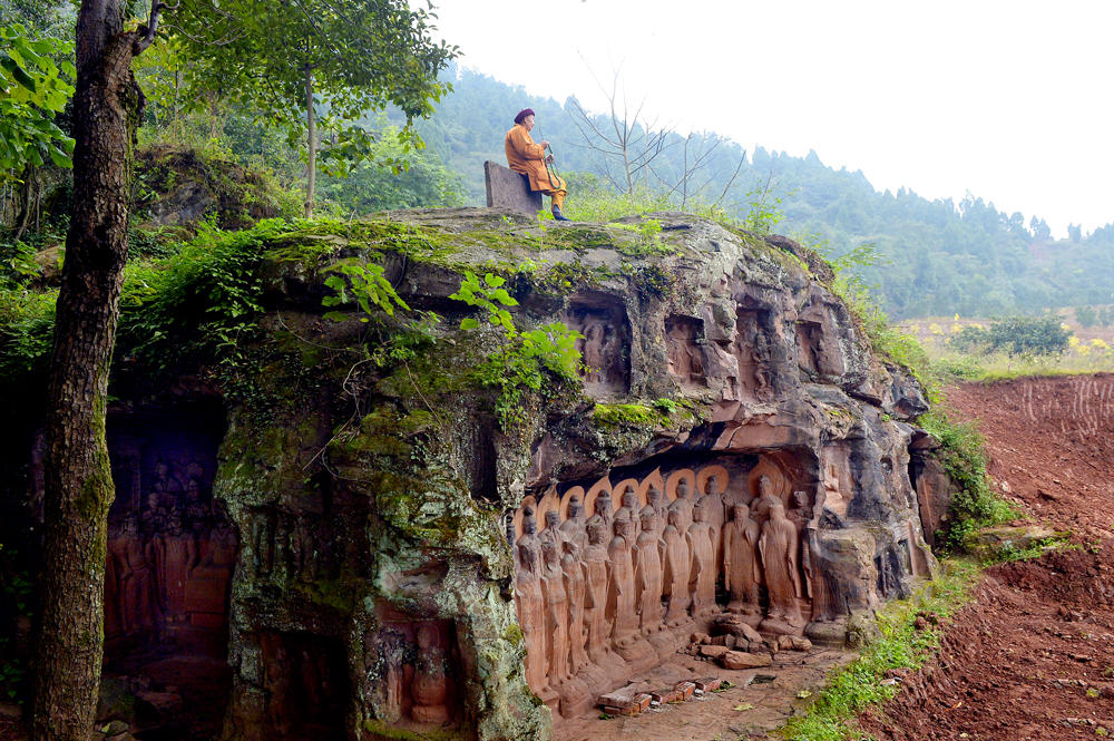 守佛人释心月说,大佛身后这几棵千年古柏,见证了仁寿大佛和唐代摩崖造像群的风风雨雨,也见证了牛角寨和高家大地的历史变迁。 (来自:朱建国)
