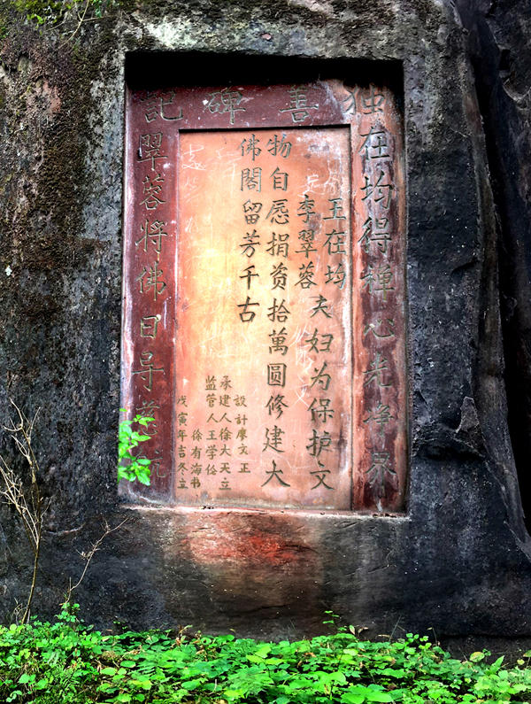 大佛果真显灵,躲过劫难必有后福。20年后,王在均成为当地远近闻名的老板级“富豪”。为兑现当初的承诺,1998年冬,王在均夫妇捐资十万元在悬崖上修建了这间 “ 大佛阁 ” ,以此碑为证。 (来自:朱建国)
