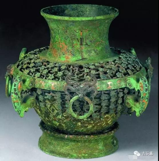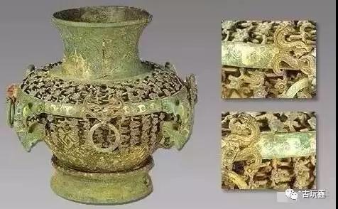 陈璋圆壶是一件重金络壶,残高为24厘米,口径12.8厘米,腹径22.2厘米,足径13.8厘米。据专家介绍,虽然长期受到20公斤黄金的压力,长埋地下二千年,在金属与应力腐蚀的作用下,腹下部镂空纹饰已有残损,但仍是中国青铜时代泥范铸造工艺技术最完美的产物,集先秦金属工艺之大成于一身,并反映了一件重大历史事件。