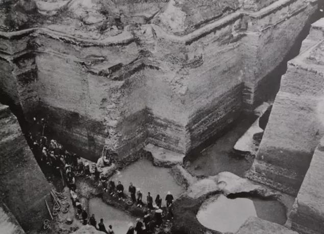 这就是宫殿发掘出来的现场。这个宫殿的右侧有一条沟,是日本人为了防护它的机场跑道修的。我们把这个沟给刷开,刷开就是铲开的意思。结果你猜沟里发现什么?一块白陶。