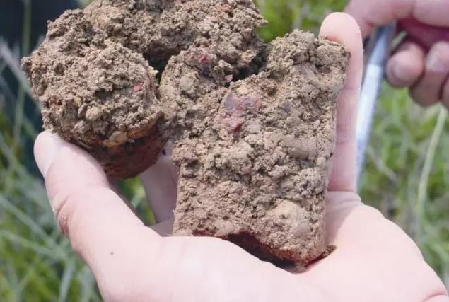 这块土是松的、散的,对不对?还有一点点红的在上头。那是什么?打到棺材了,底下有墓葬。这就是考古勘探,学多了不好。