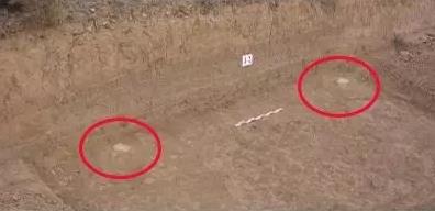 沟里头还发现了大量的夯土建筑,这个夯土结构是不一样的。这张图上有两个小白点,那是石头。石头干吗用的呢?古人盖房子的时候立柱,柱子底下放块石头,这叫柱础石。这样的柱础石发现了很多,其中有的柱础石底下,像左下角的这个,还埋着小孩。