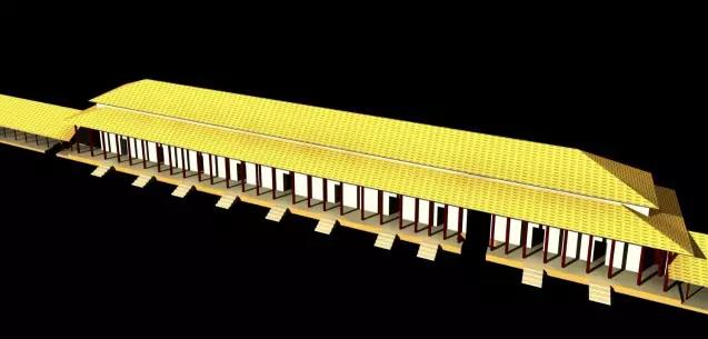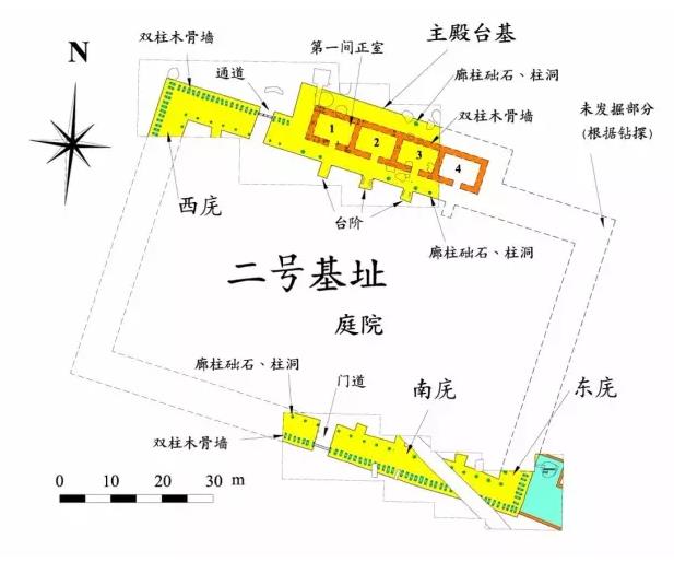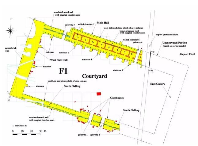 发掘出来的结果非常地震憾,这是商朝保存最好的一个建筑基址。大家看,这条路的西侧三分之二 ,只是这个建筑的三分之二,挖出来了。东边靠近机场跑道那边还有三分之一没有挖,西边的这一块有多大呢?