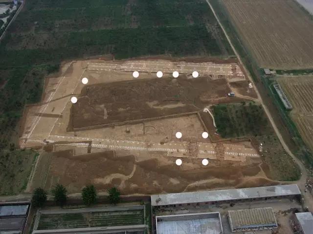 这么大的房子,一百七十米宽,前后进深九十多米,中间院子一万平米的建筑,不杀人是不可能的。所以我要求我的考古队给我找杀人坑。结果不出所料,在房子北边的台阶前面,这些白点全是祭祀坑。