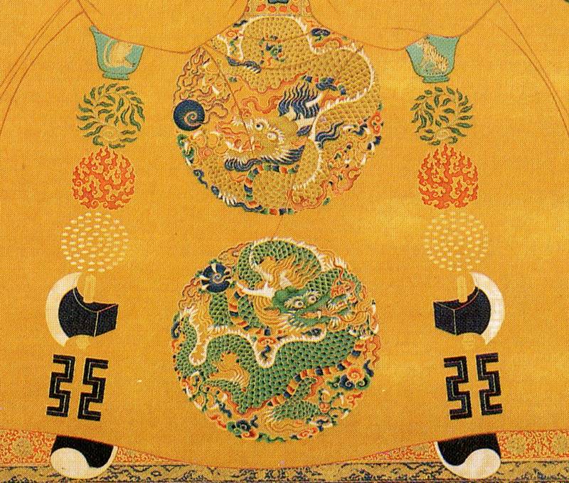 而隋代则确立了每个章纹在龙袍上的固定位置,十二章纹作为帝王专属纹饰的完全确立,是在隋大业元年。明代依旧维持了十二章纹的规制,到清代,十二章纹渐失其主要地位,演变为多种装饰图案中的一种,要仔细观察才能发现其位置。