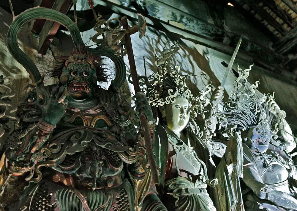 此时天色已晚,凭借手电的光线,可以看到一尊尊彩塑面目狰狞,动态夸张