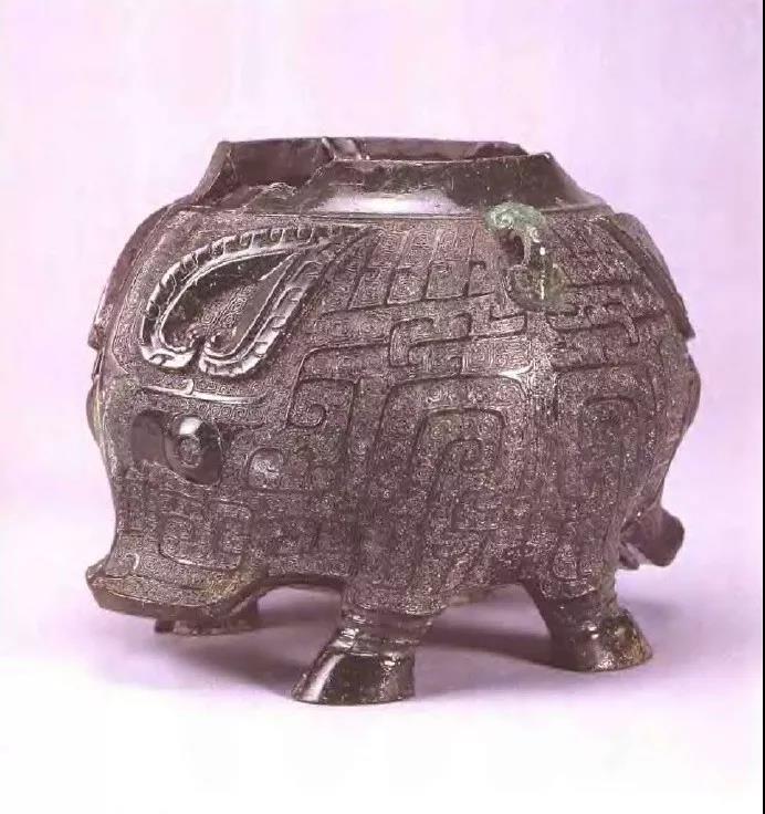 器物周身布满纹饰,头部为兽面纹,腹部与背部为鳞甲纹,四肢和臀部为倒立夔龙纹和