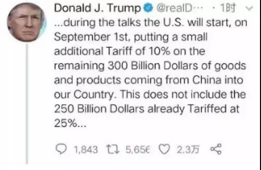 北京时间8月2日凌晨1点30分,川普突然宣布,将从9月1日开始对中国剩余3000亿美元商品加征10%的关税!