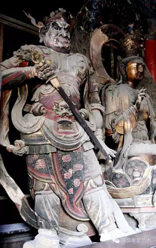 披铠甲,头戴冠,手持法器,脚踏小鬼,威风凛凛,时时守护佛