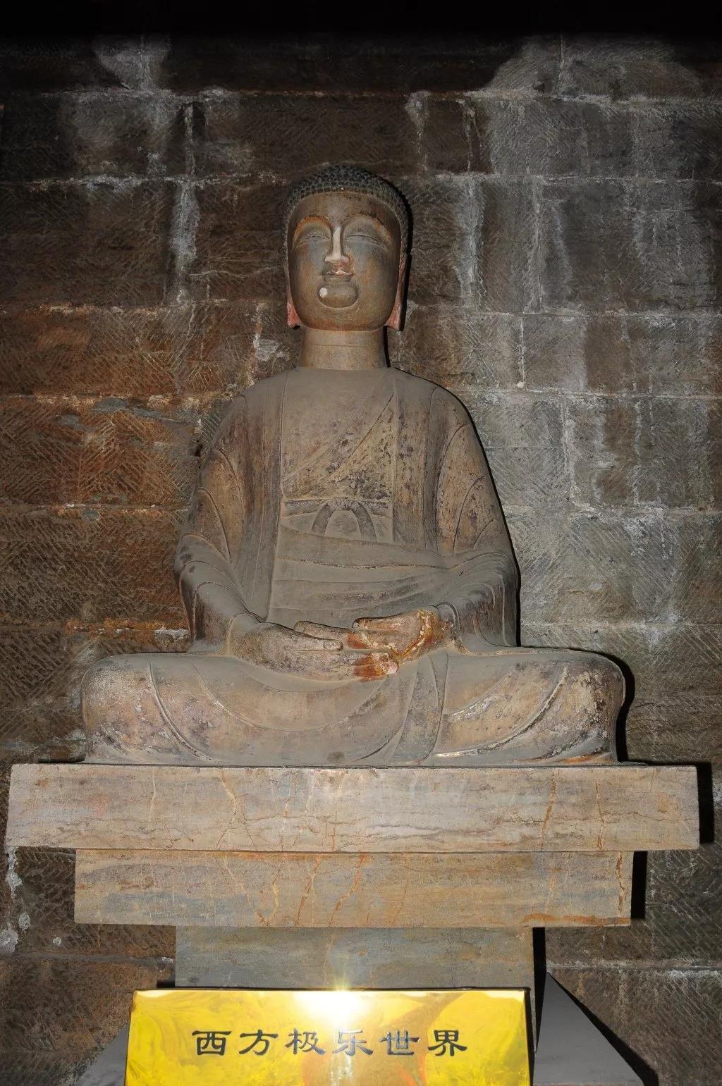 四佛各有名号,西边佛像叫极乐世界无量寿佛,南边一尊称欢喜世界宝生佛,东边一尊为阿閦佛,