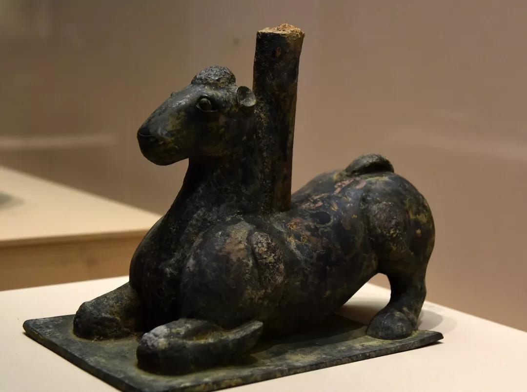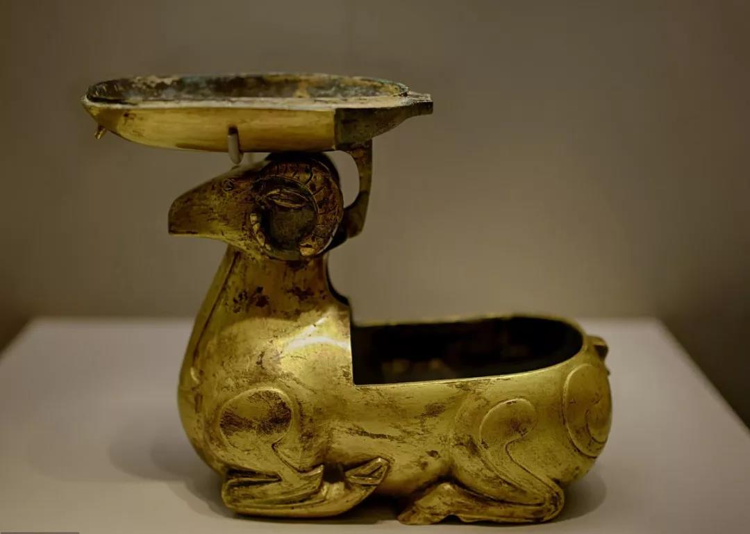 汉的艺术家想象力丰富,写实能力也很强。这件鎏金铜羊型灯,可谓杰作。不用的时候把灯座放下,就是一头绵羊。升起灯座就是油灯,还可把燃油储藏在羊肚子里。喜羊羊,大吉祥。羊者,吉祥如意也。现如今送礼送吉祥,依然为人称道。