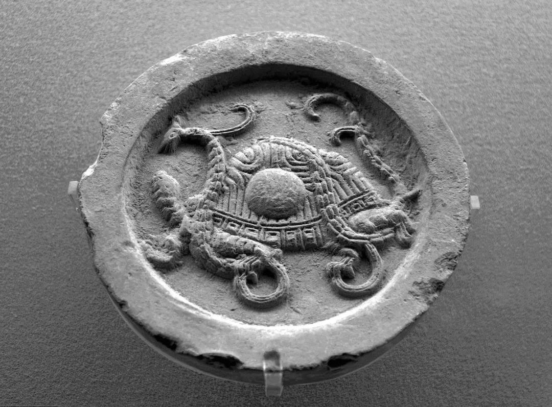 先民在渔猎耕织过程中,形成了自然崇拜。对某些生物和自然现象报以崇敬之心。古代的四灵,就是这样产生的。四灵为青龙,朱雀,白虎,玄武。分别代表四方之神。图为玄武,是一头巨龟和蛇形动物缠绕的形象代表北方。