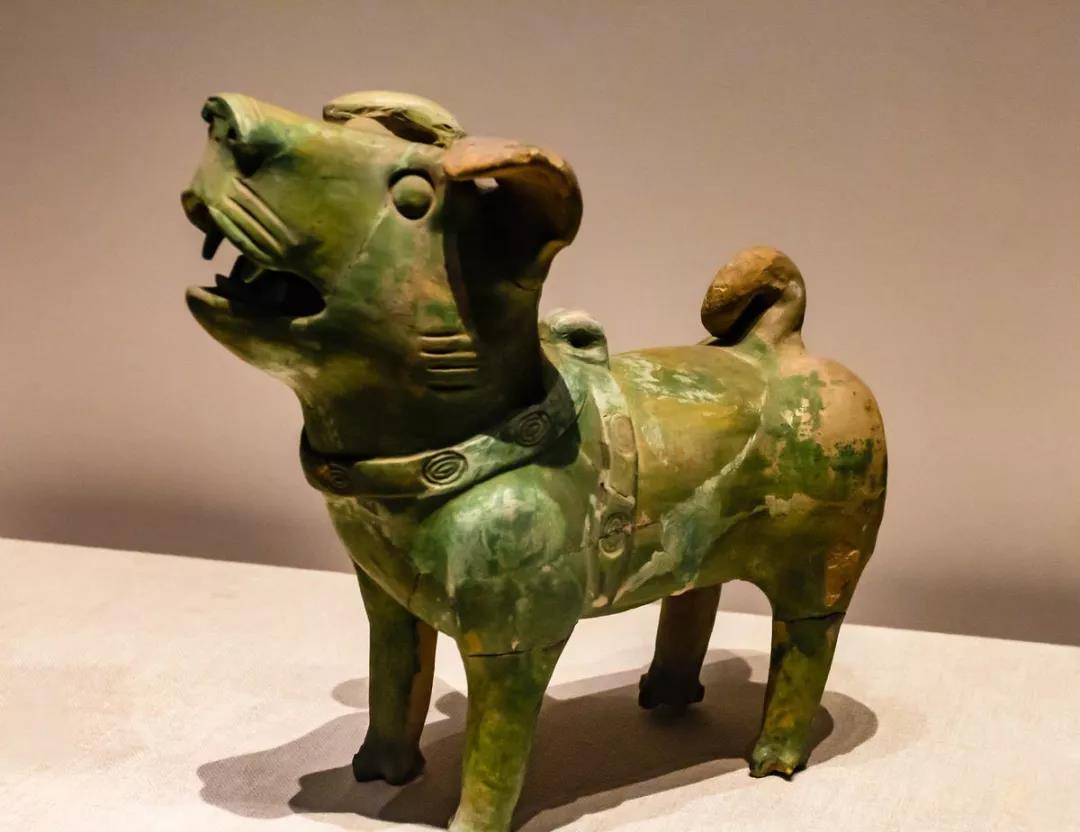 图示的这件陶犬,可是主人的宠物。请注意它的项圈,除了脖子上有一条,肚子上还有一条。养过狗的朋友应该都会为这个设计暗暗称奇。如果仅靠脖子上的项圈,狗狗在奔跑的时候,会被勒得喘不过气。带上应该还装饰有金属器,此犬腿短尾短头大,也不类田园犬。