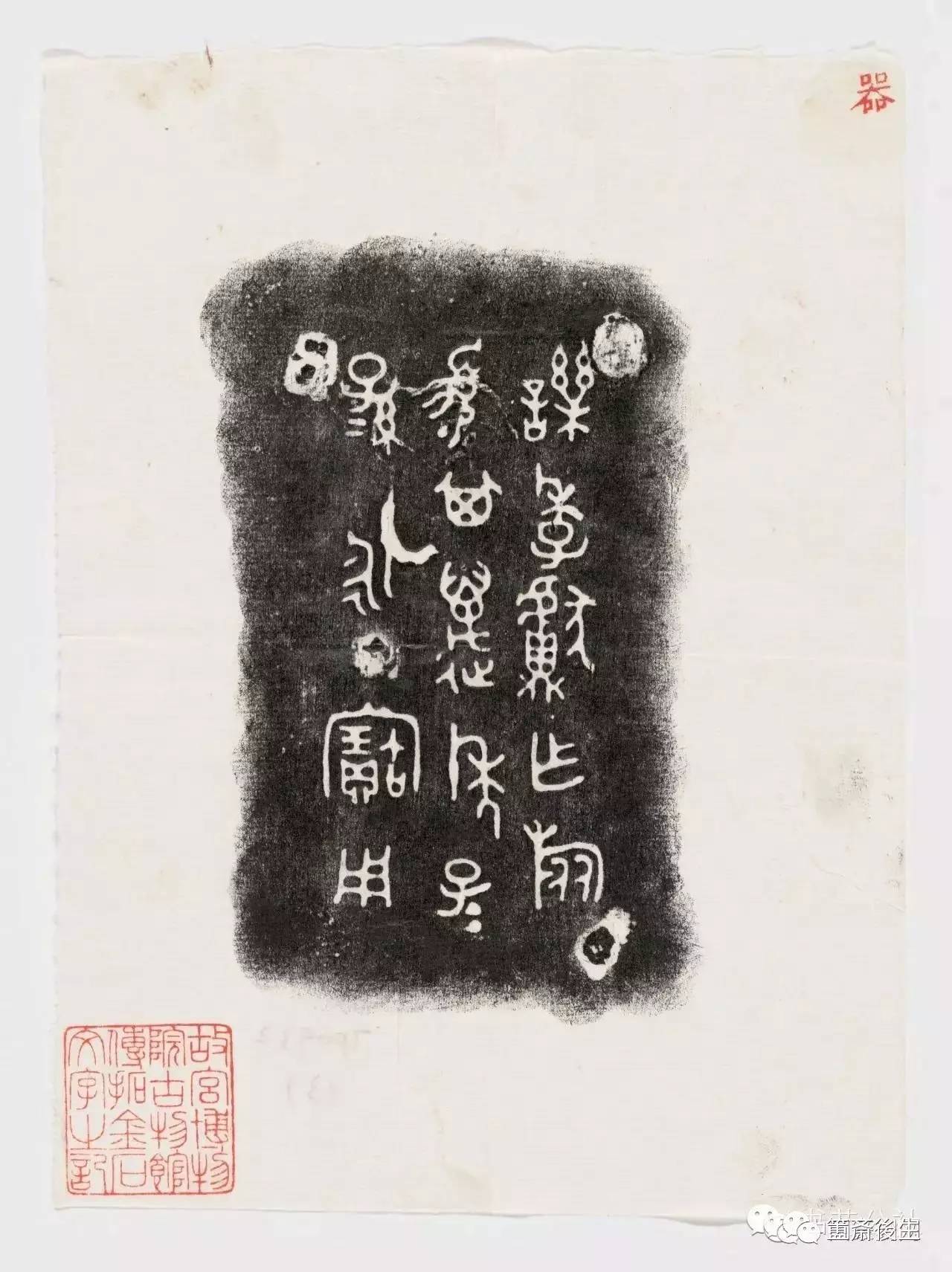 故宮博物院古物館傳拓周罍一件 . 原刻. [China : s.n., 周, between 1027 and 256 B.C.] 拓片, 摺葉, 未托裱, 墨紙尺寸: 39 x 33 cm + 4.5 x 17 cm. 民國(1925-1931)拓本, 全形拓. 金文