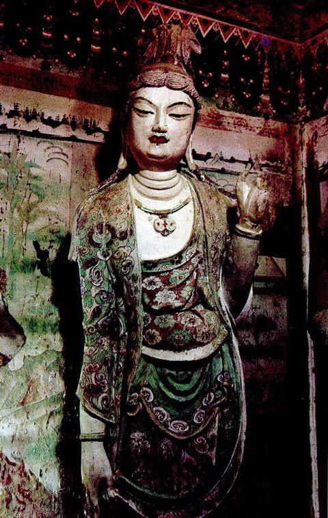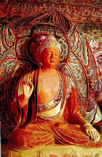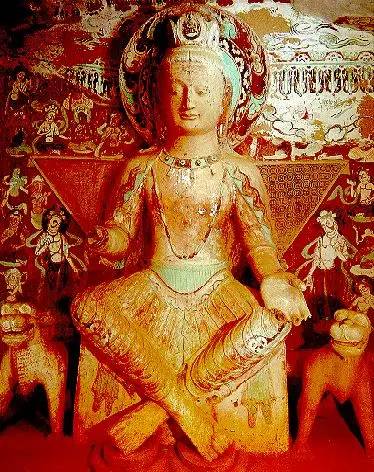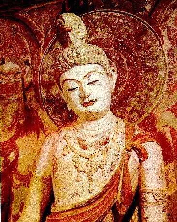 (3)从北魏早期着手大力扩建,五世纪末莫高亿已有相当的规模。经历北魏、西魏、北周、隋、唐、五代、宋、西夏、元,直至十四世纪相继凿建,遂成为巨大的石倌群。现编号492个,彩塑2400余身,其中北朝洞窟近40座 。北朝窟形主要有禅窟,佛殿式窟,中心柱窟。隋唐以来仍以覆斗顶方窟为主,出现了别具肜途的大像窟、大卧佛窟,以及由佛殿窟演变出来的中心设坛的方窟。北朝尤重弥 勒信仰,一此坟要洞窟多造佛装弥 勒、倚坐弥勒和弥勒菩萨像。中心柱窟多系中心柱上造像及窟壁画千佛(兼部分佛教故事)的千佛窟。中心柱四面龛多为释迦“四相”或“八相”。隋唐以后转入了以佛为中心,菩萨、弟子、天王、力土、供养菩萨为胁侍的一铺三身至九身,乃至十多身的造像。 安西榆林窟,现存洞窟41个,大约始凿于北魏、唐、五代、宋、西夏、元代均有建造。可惜塑像已很少见。壁画报 题材内容和风格大多与莫高窟同时期的洞窟相同,其西夏、元代洞窟中的内容可补莫高窟之不足。 西千佛洞,共有北朝、隋、唐、宋、西夏窟龛20个,大致于莫高窟同时期洞窟相似。