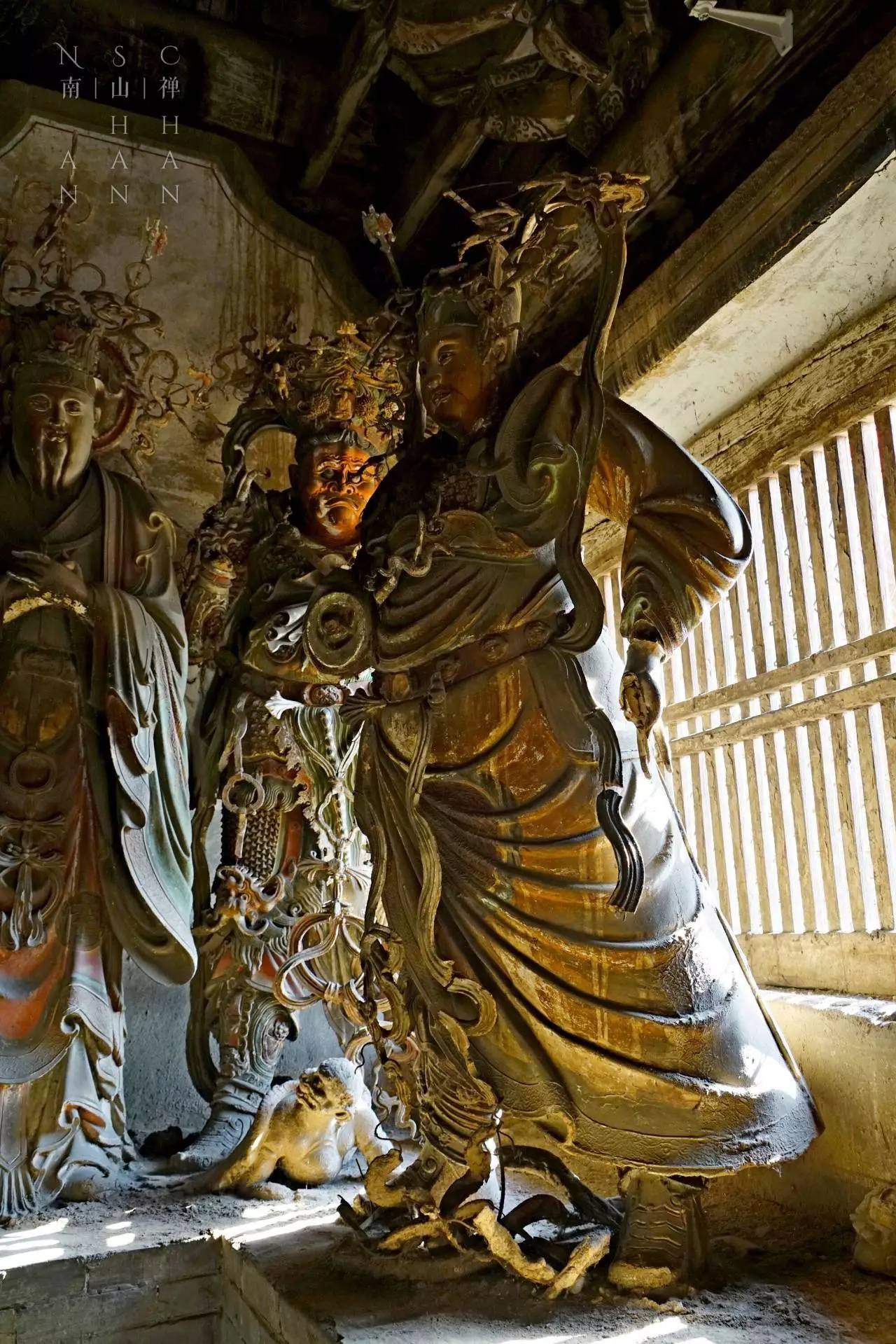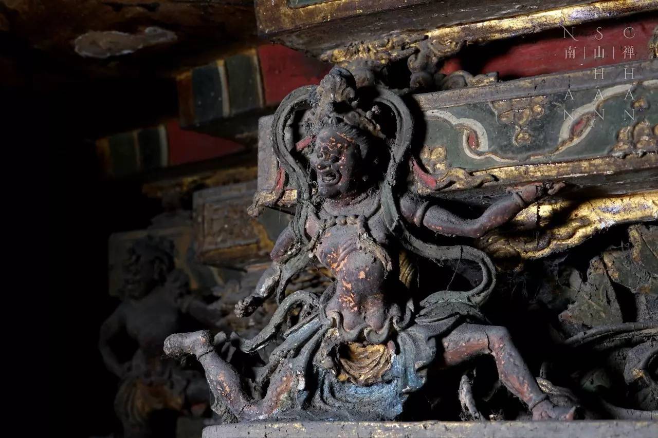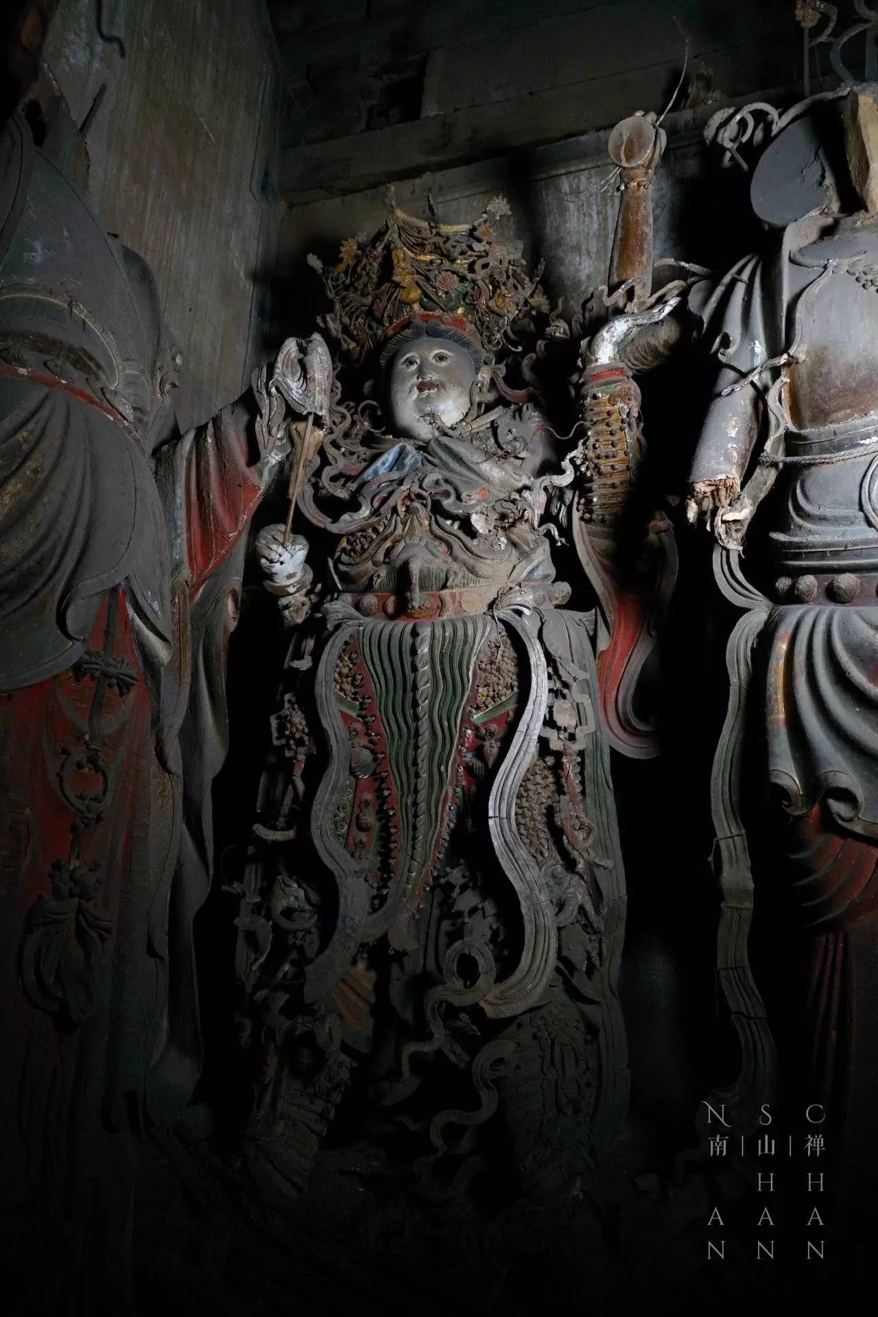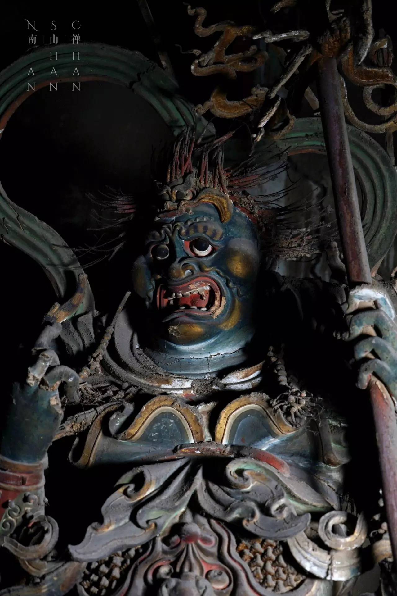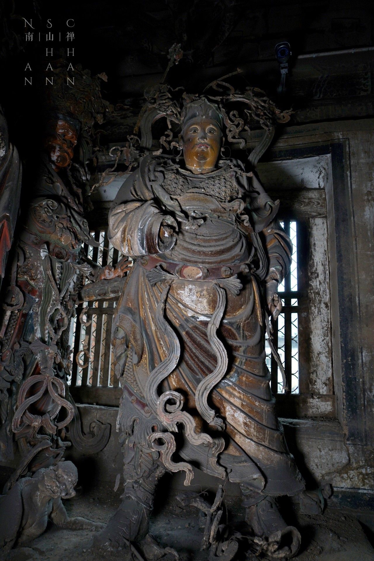 释迦牟尼佛居于殿内中央,趺坐于高高的须弥座上,背光悬塑,金碧辉煌,佛脸部的金箔被无知者刮去。文殊、普贤菩萨站立于佛两旁的莲花宝座上,可惜头部遗失,损毁严重。释迦佛背后是观音菩萨,也只余残身。大殿的东、北、西侧塑二十四诸天,这些塑像比真人高大,有的眼珠突出,有的头发倒竖,有的脚趾抓地,有的铠甲护身,其造型生动奇特,形态各异,栩栩如生。