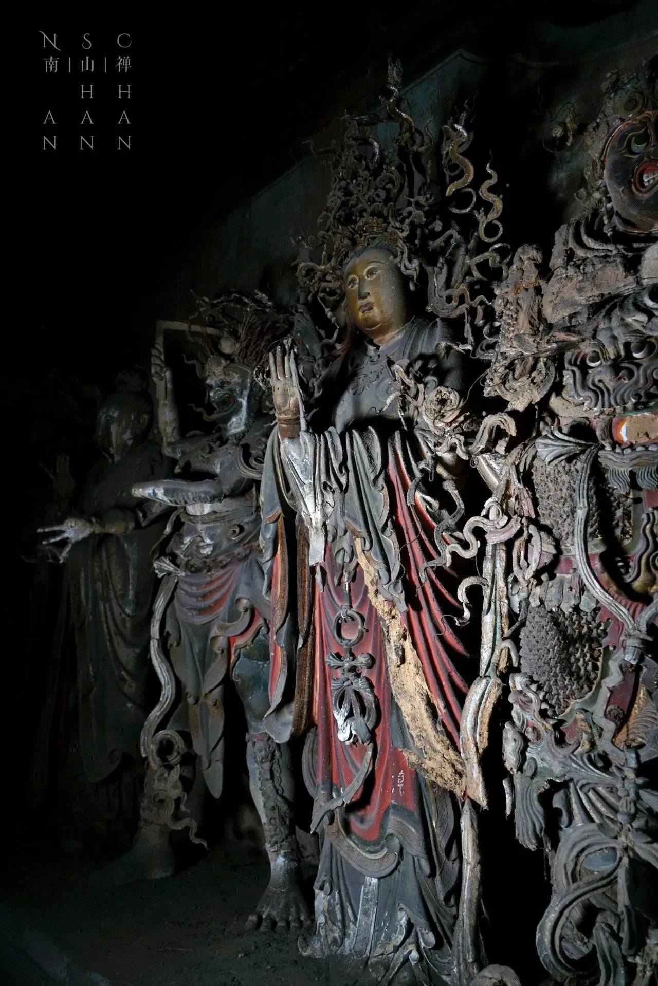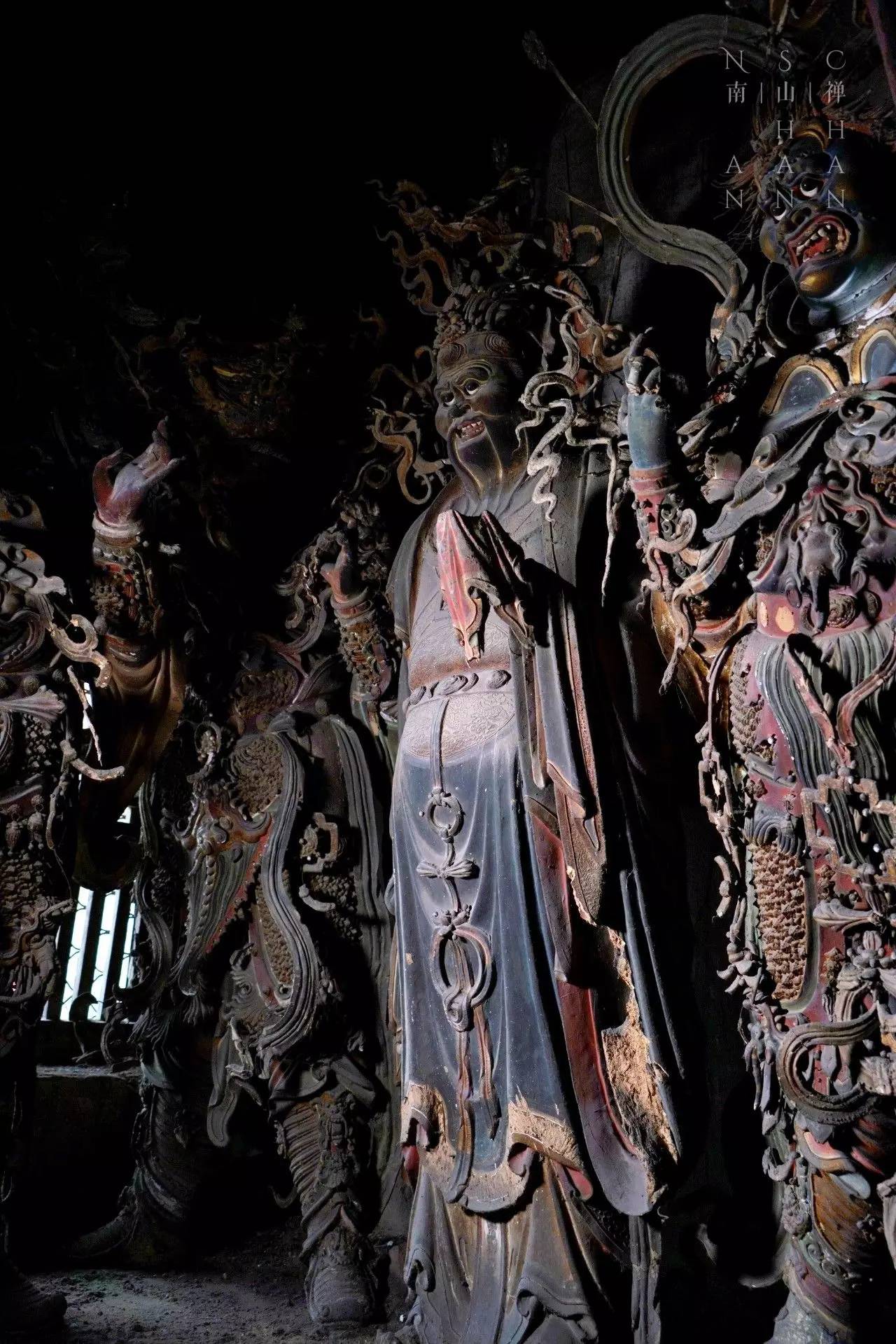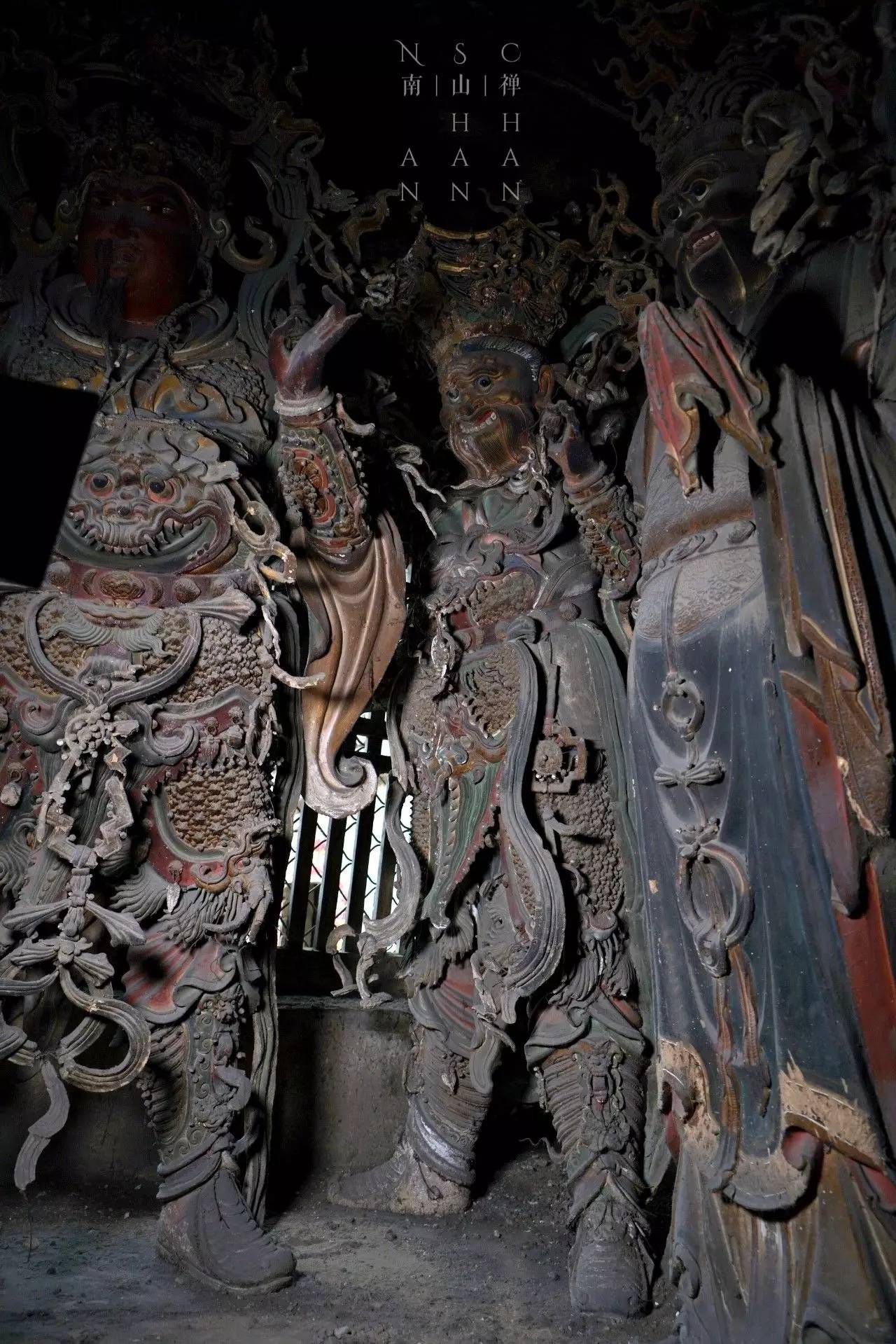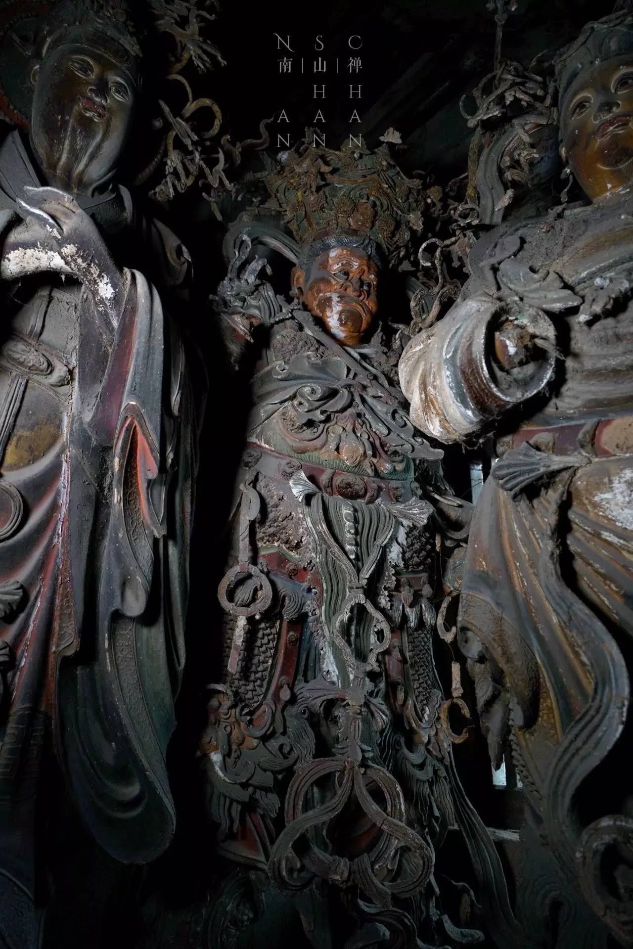 释迦牟尼佛居于殿内中央,趺坐于高高的须弥座上,背光悬塑,金碧辉煌,佛脸部的金箔被无知者刮去。文殊、普贤菩萨站立于佛两旁的莲花宝座上,可惜头部遗失,损毁严重。释迦佛背后是观音菩萨,也只余残身。大殿的东、北、西侧塑二十四诸天,这些塑像比真人高大,有的眼珠突出,有的头发倒竖,有的脚趾抓地,有的铠甲护身,其造型生动奇特,形态各异,栩栩如生。