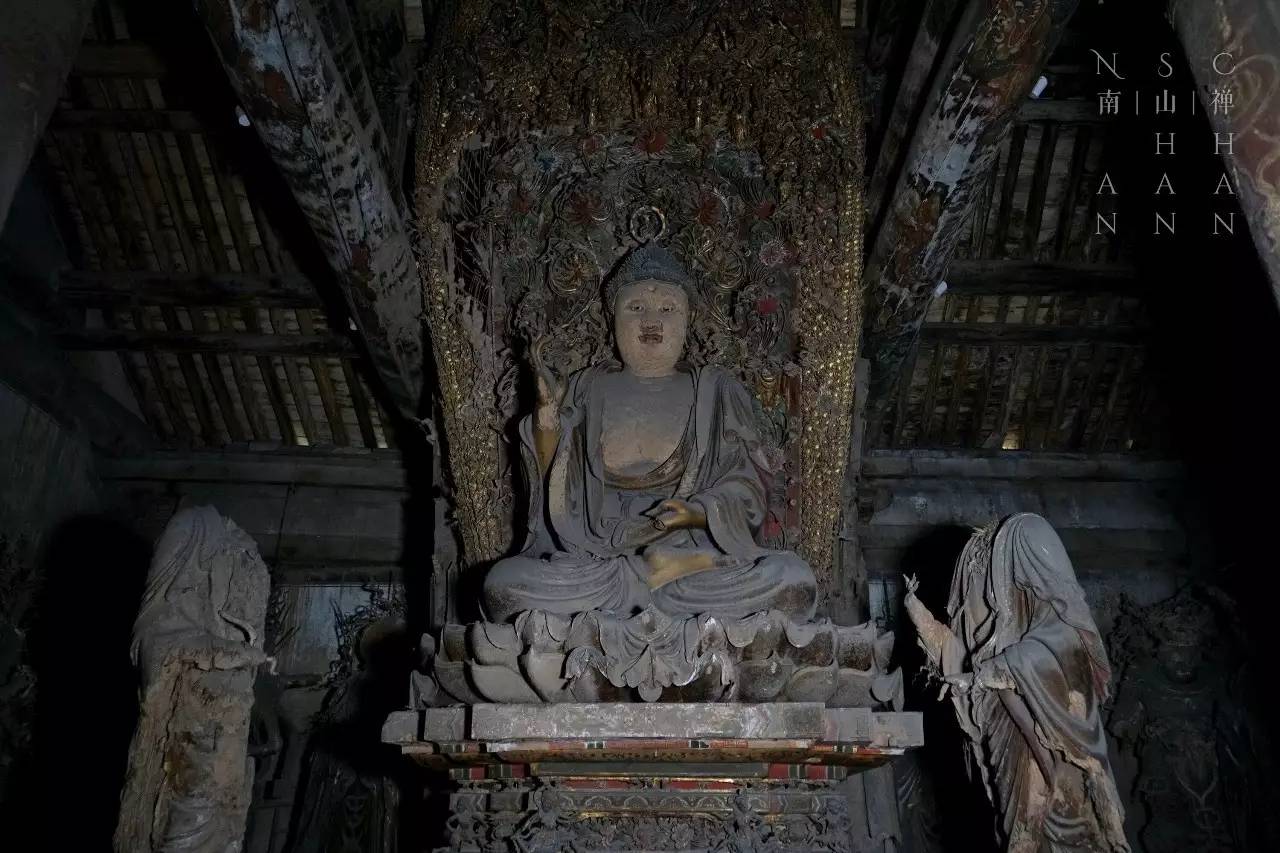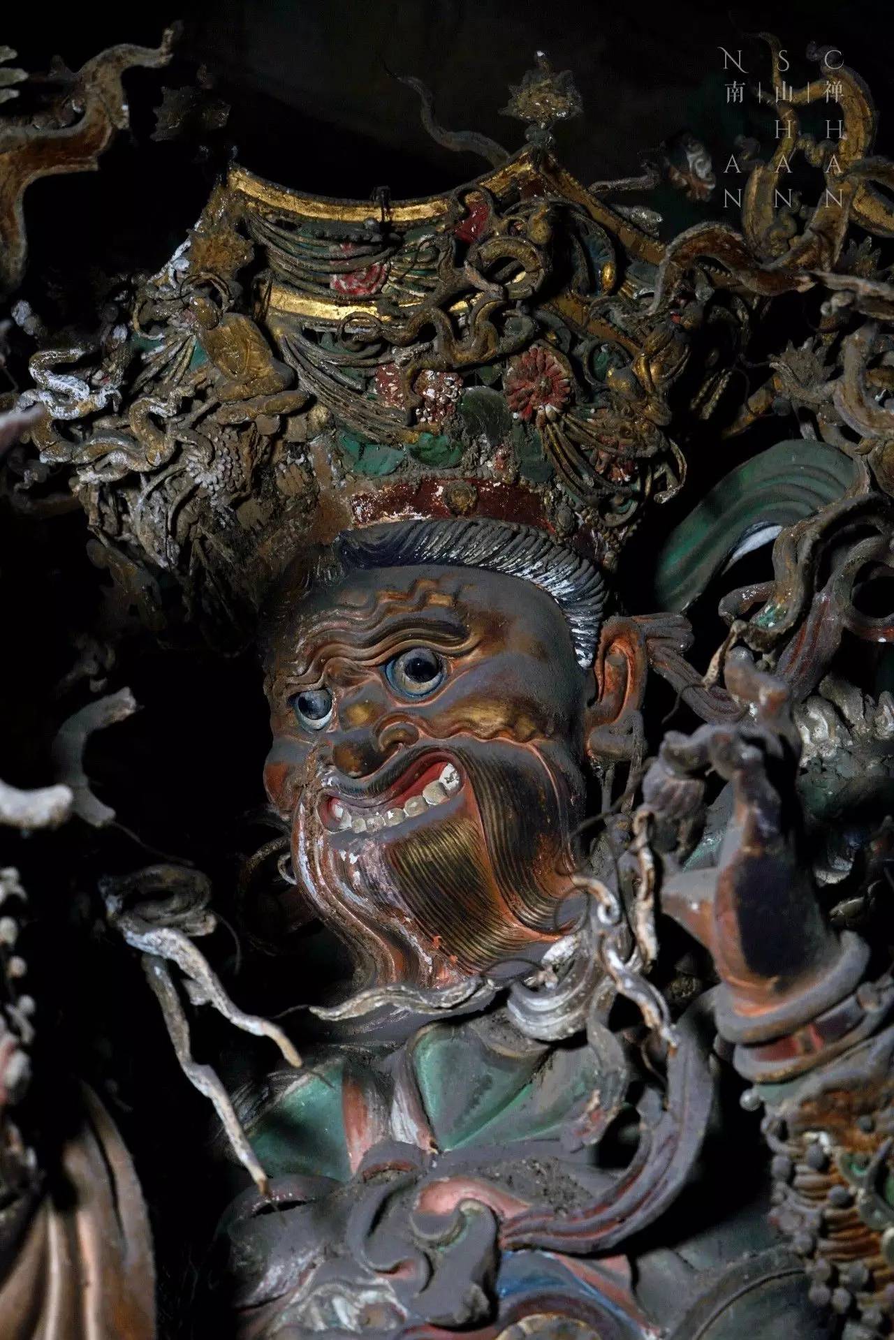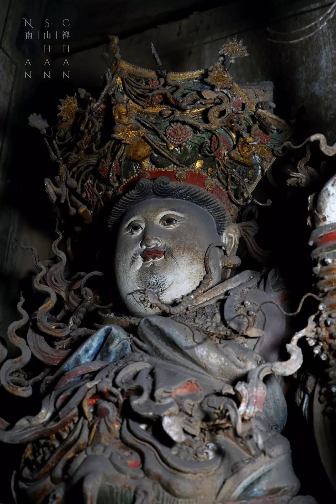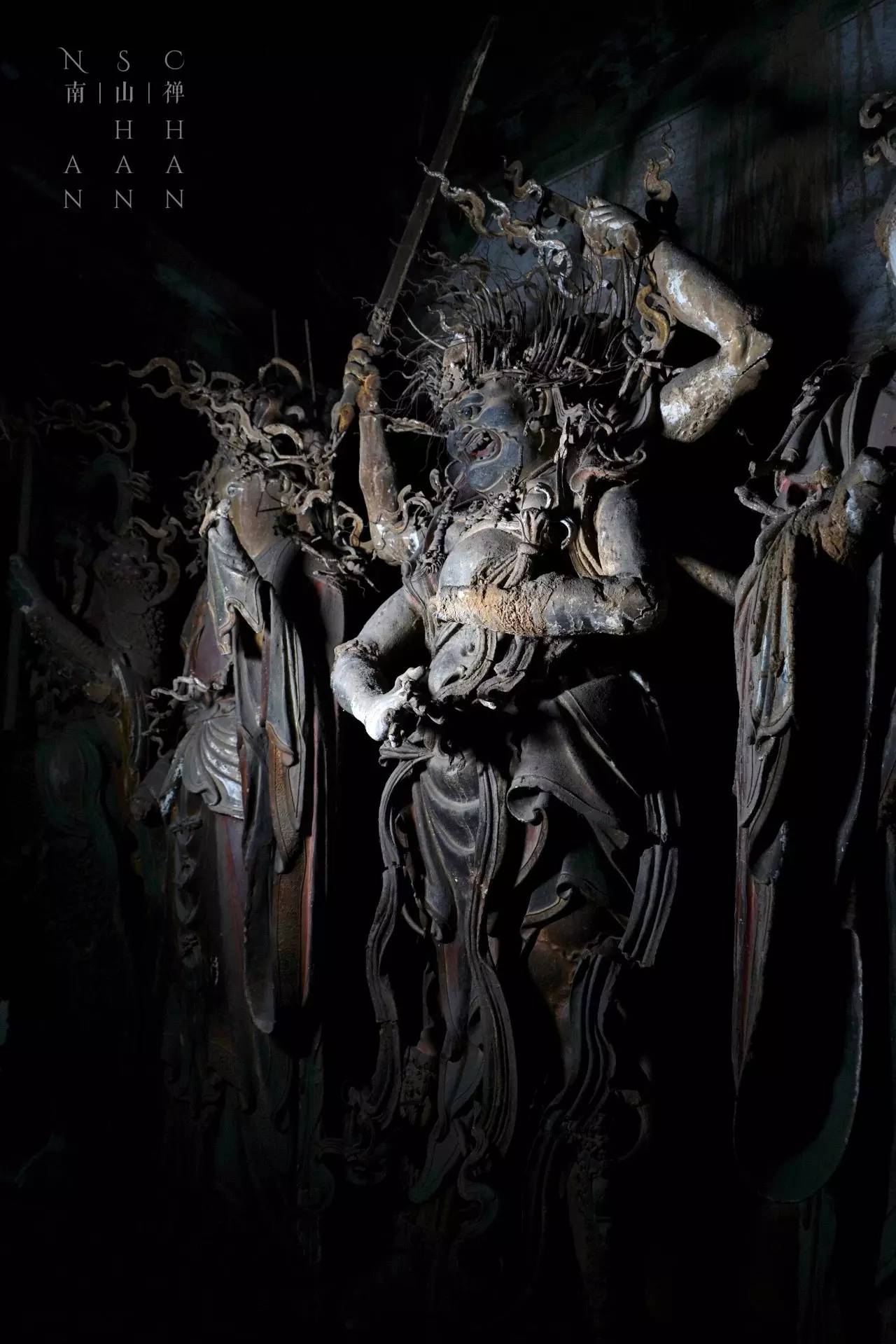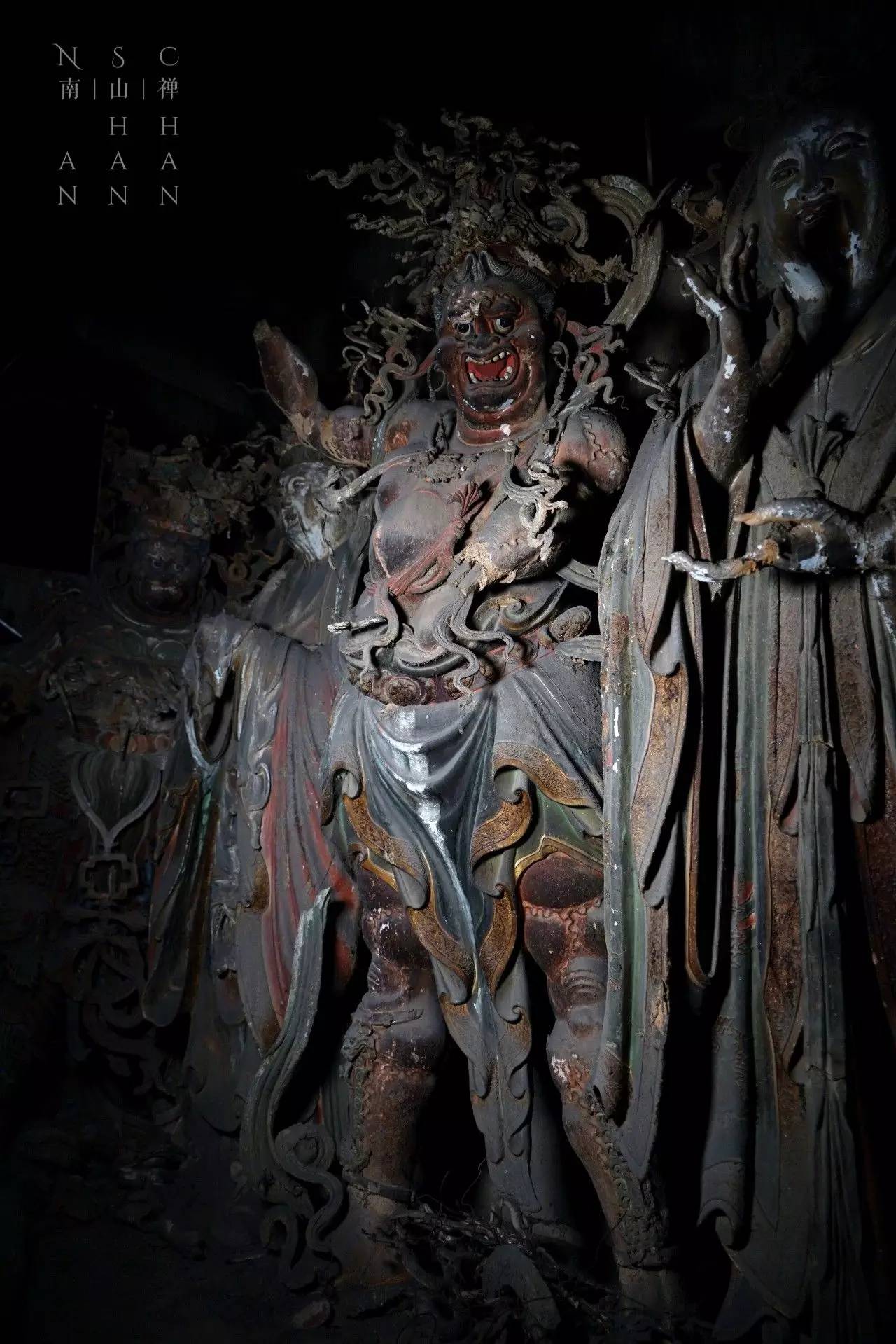 释迦牟尼佛居于殿内中央,趺坐于高高的须弥座上,背光悬塑,金碧辉煌,佛脸部的金箔被无知者刮去。文殊、普贤菩萨站立于佛两旁的莲花宝座上,可惜头部遗失,损毁严重。释迦佛背后是观音菩萨,也只余残身。大殿的东、北、西侧塑二十四诸天,这些塑像比真人高大,有的眼珠突出,有的头发倒竖,有的脚趾抓地,有的铠甲护身,其造型生动奇特,形态各异,栩栩如生。