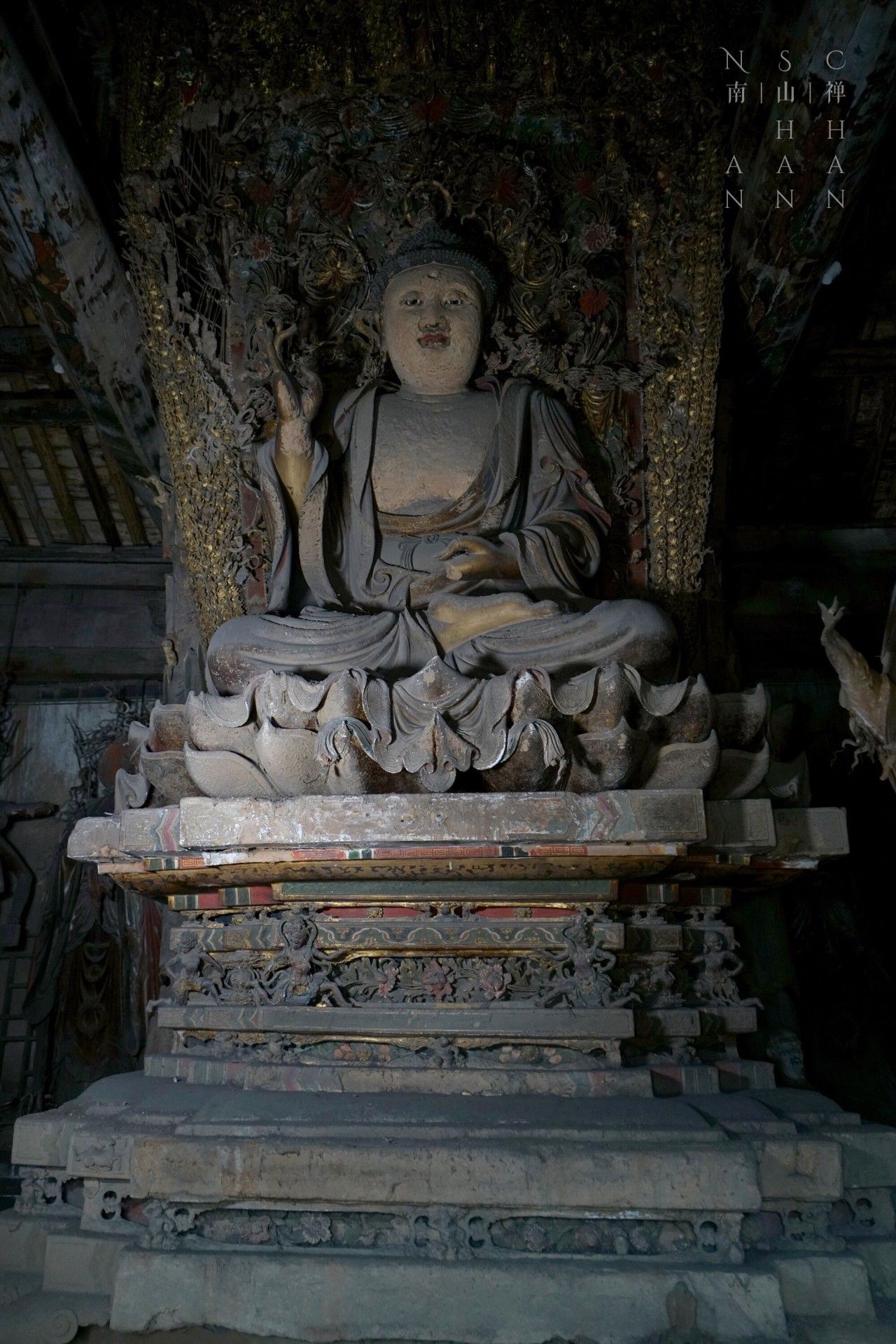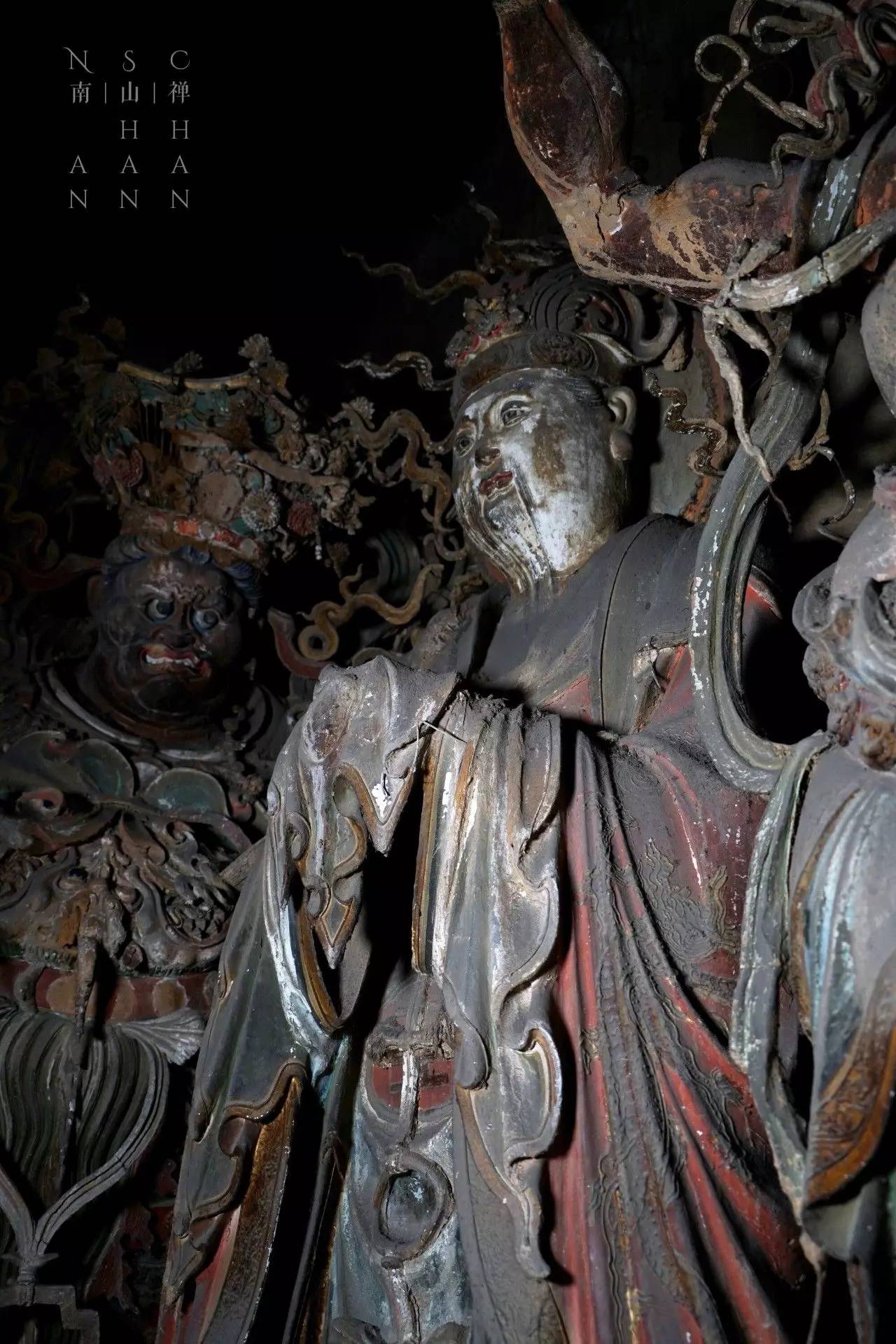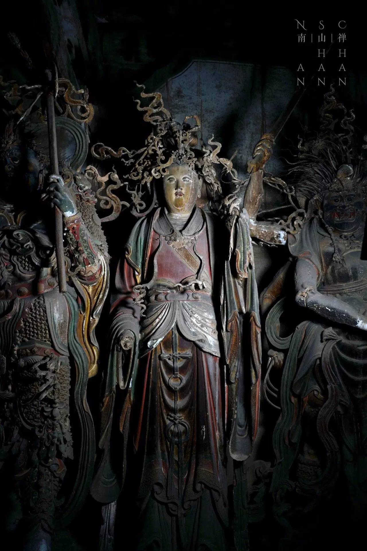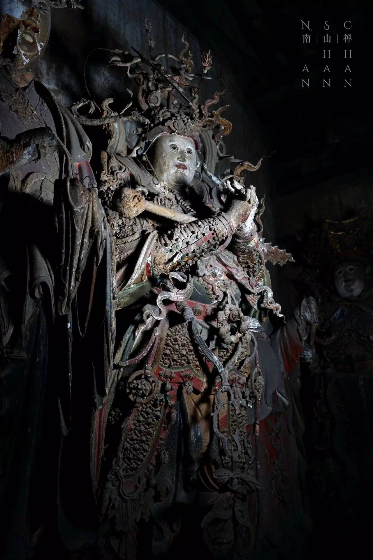 释迦牟尼佛居于殿内中央,趺坐于高高的须弥座上,背光悬塑,金碧辉煌,佛脸部的金箔被无知者刮去。文殊、普贤菩萨站立于佛两旁的莲花宝座上,可惜头部遗失,损毁严重。释迦佛背后是观音菩萨,也只余残身。大殿的东、北、西侧塑二十四诸天,这些塑像比真人高大,有的眼珠突出,有的头发倒竖,有的脚趾抓地,有的铠甲护身,其造型生动奇特,形态各异,栩栩如生。