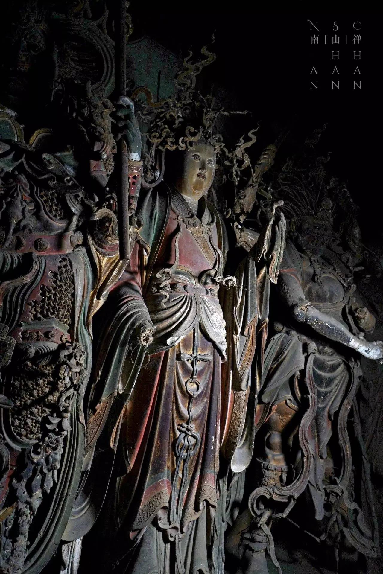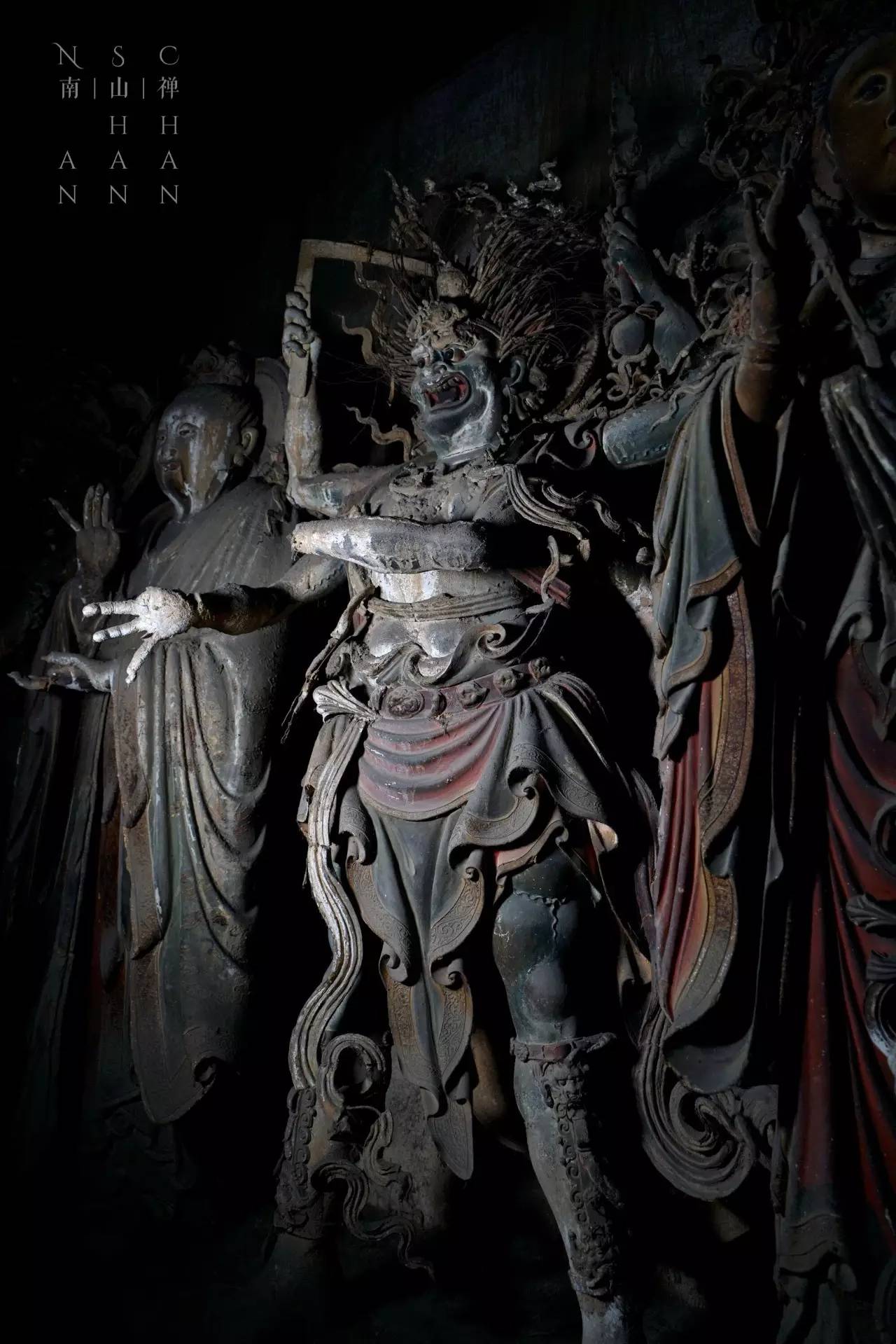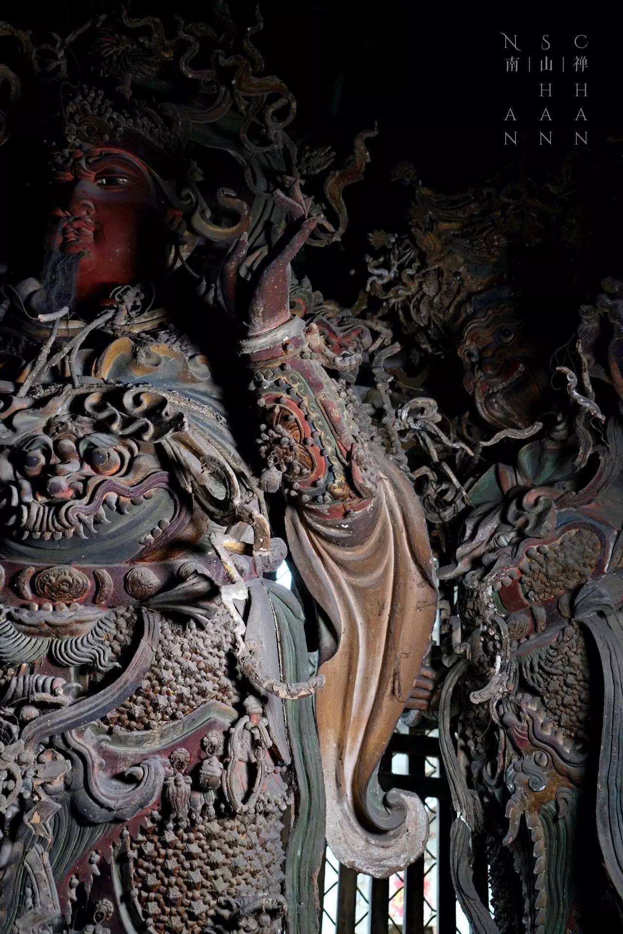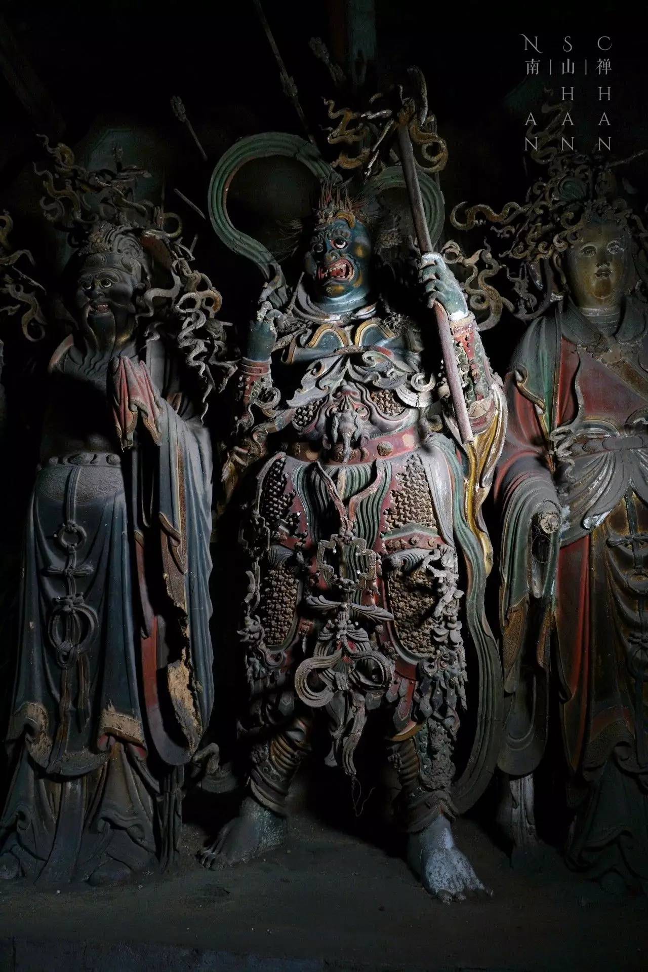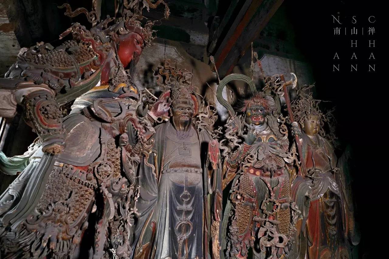 释迦牟尼佛居于殿内中央,趺坐于高高的须弥座上,背光悬塑,金碧辉煌,佛脸部的金箔被无知者刮去。文殊、普贤菩萨站立于佛两旁的莲花宝座上,可惜头部遗失,损毁严重。释迦佛背后是观音菩萨,也只余残身。大殿的东、北、西侧塑二十四诸天,这些塑像比真人高大,有的眼珠突出,有的头发倒竖,有的脚趾抓地,有的铠甲护身,其造型生动奇特,形态各异,栩栩如生。