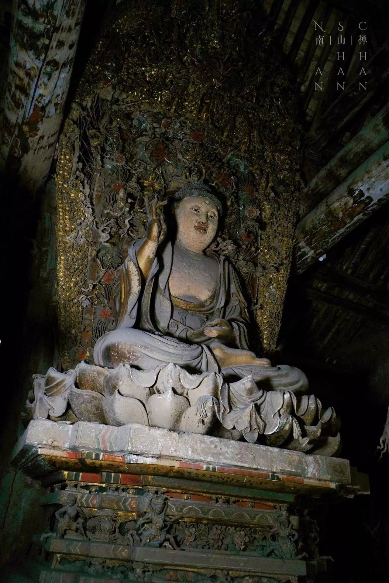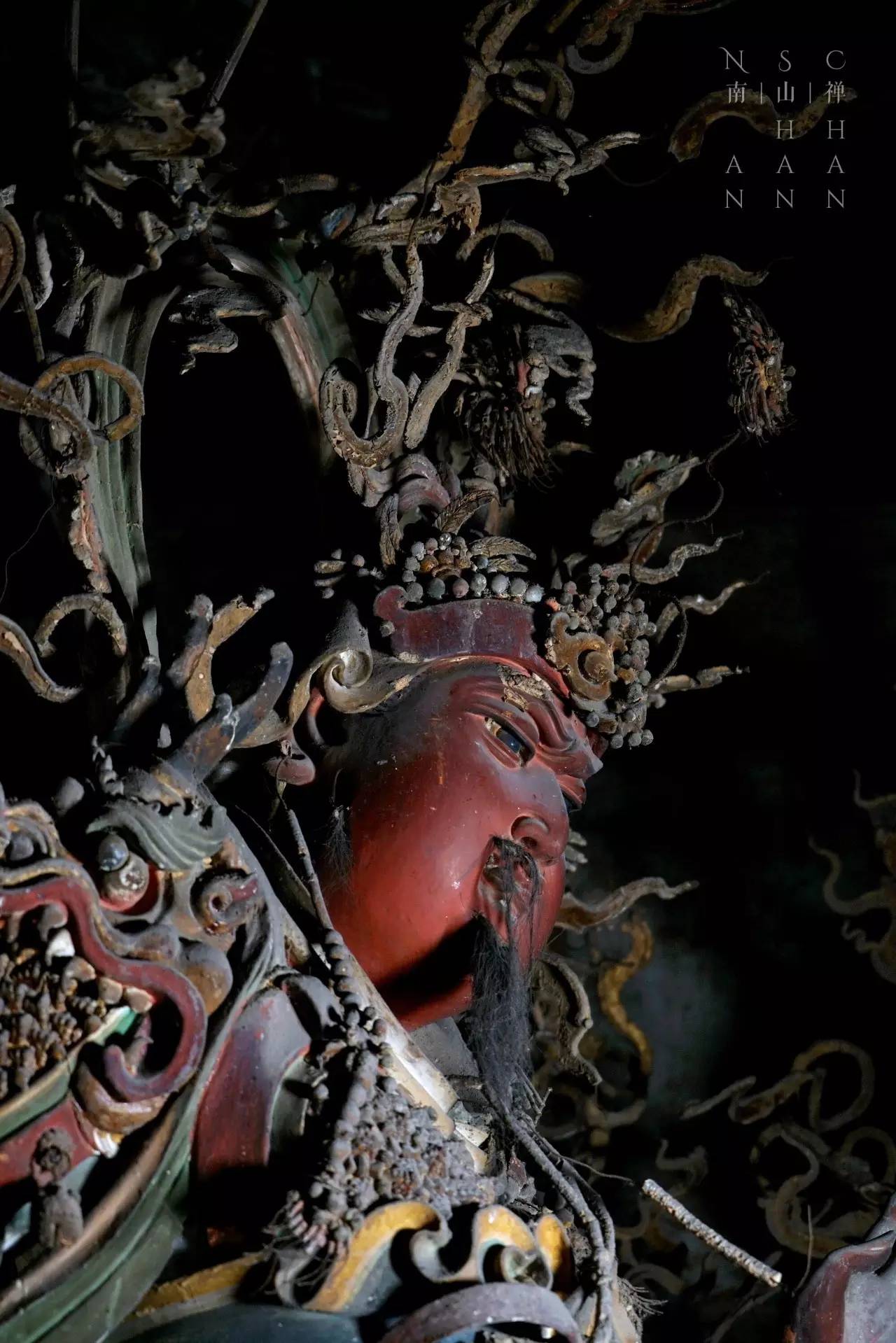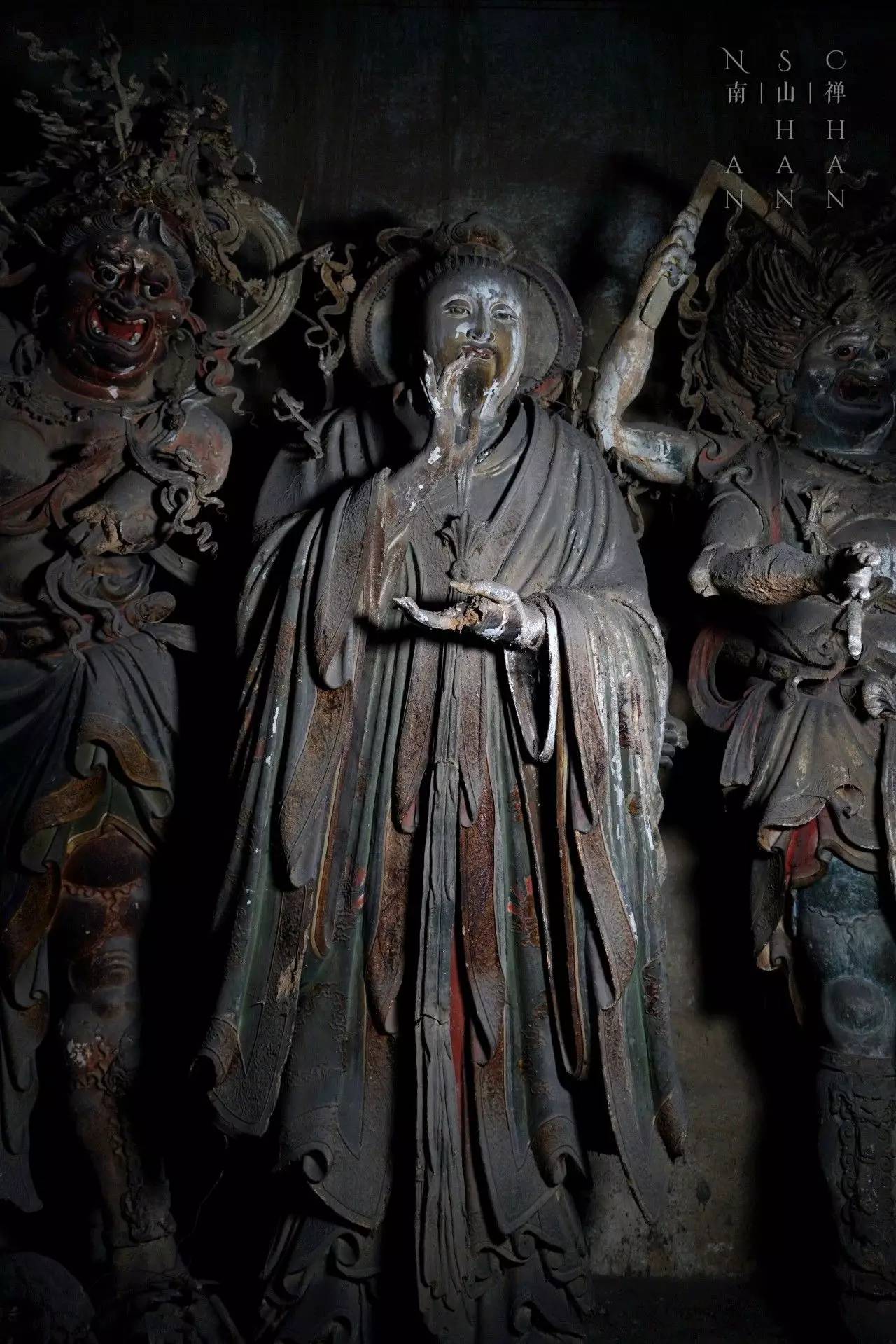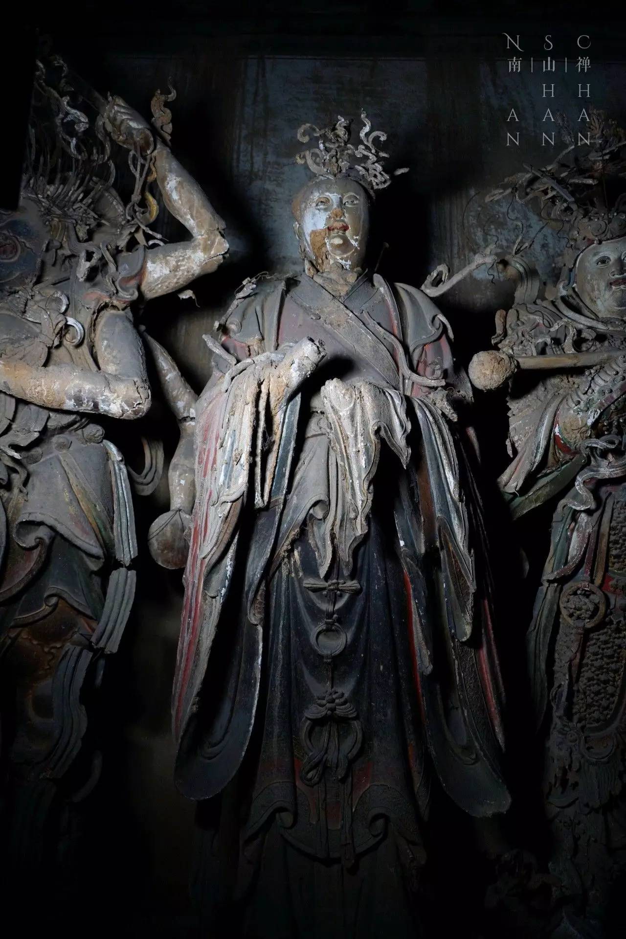 释迦牟尼佛居于殿内中央,趺坐于高高的须弥座上,背光悬塑,金碧辉煌,佛脸部的金箔被无知者刮去。文殊、普贤菩萨站立于佛两旁的莲花宝座上,可惜头部遗失,损毁严重。释迦佛背后是观音菩萨,也只余残身。大殿的东、北、西侧塑二十四诸天,这些塑像比真人高大,有的眼珠突出,有的头发倒竖,有的脚趾抓地,有的铠甲护身,其造型生动奇特,形态各异,栩栩如生。