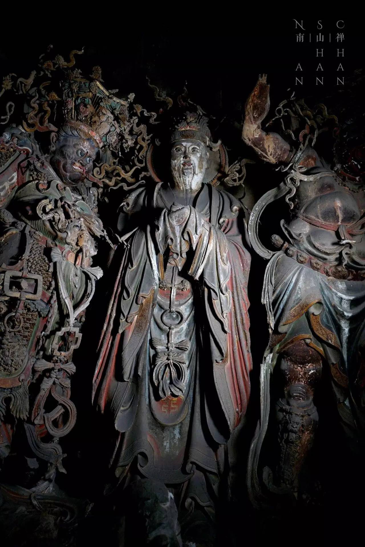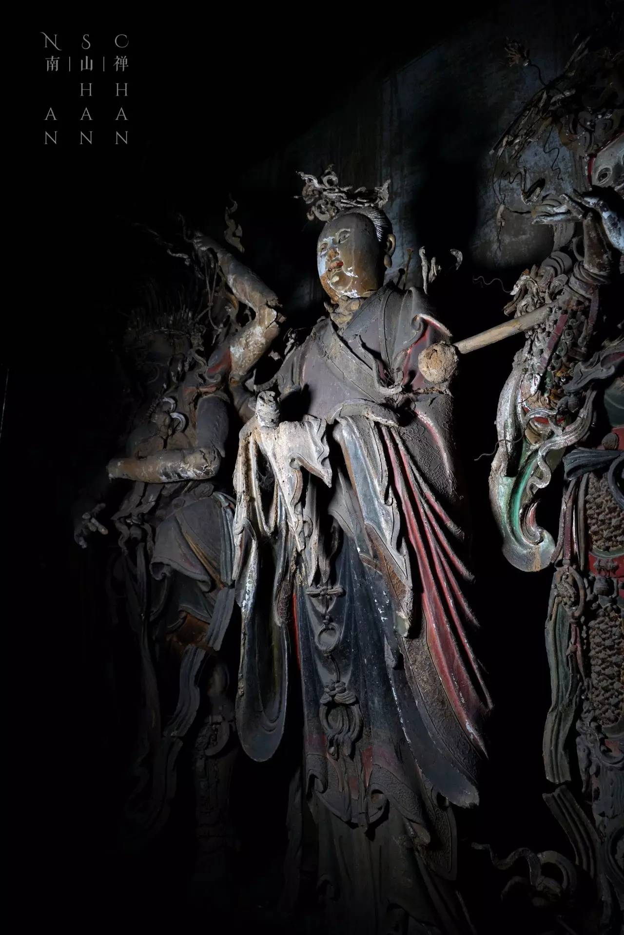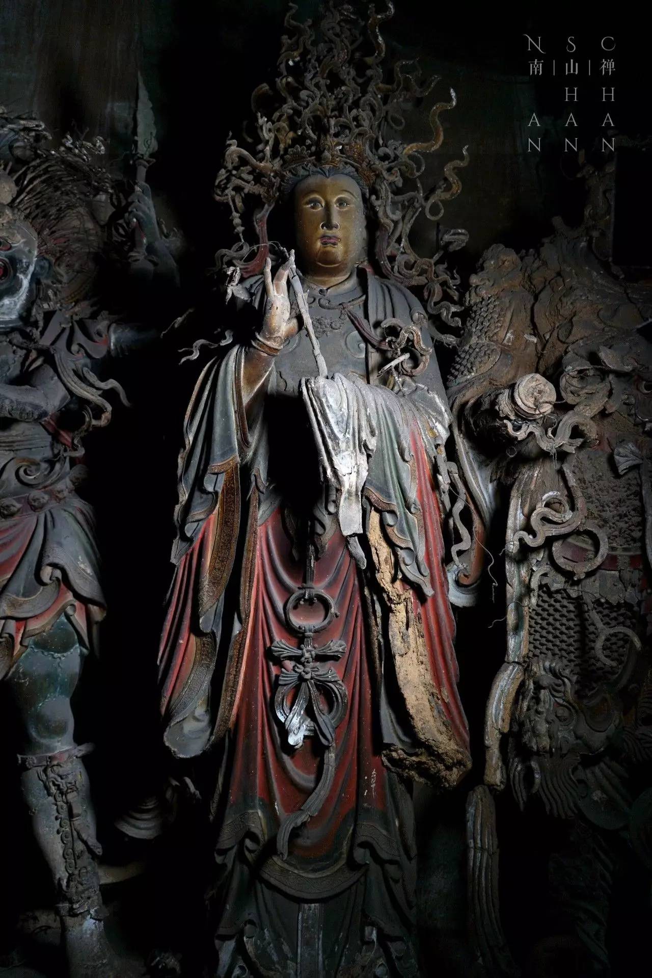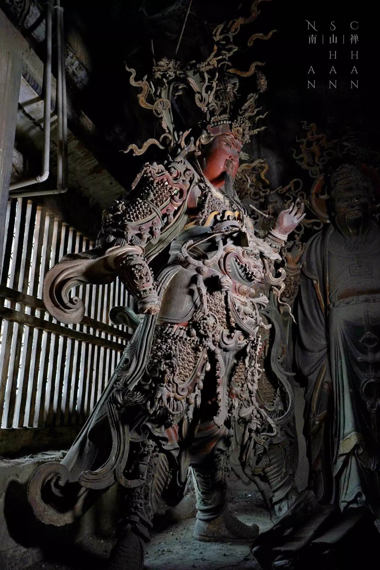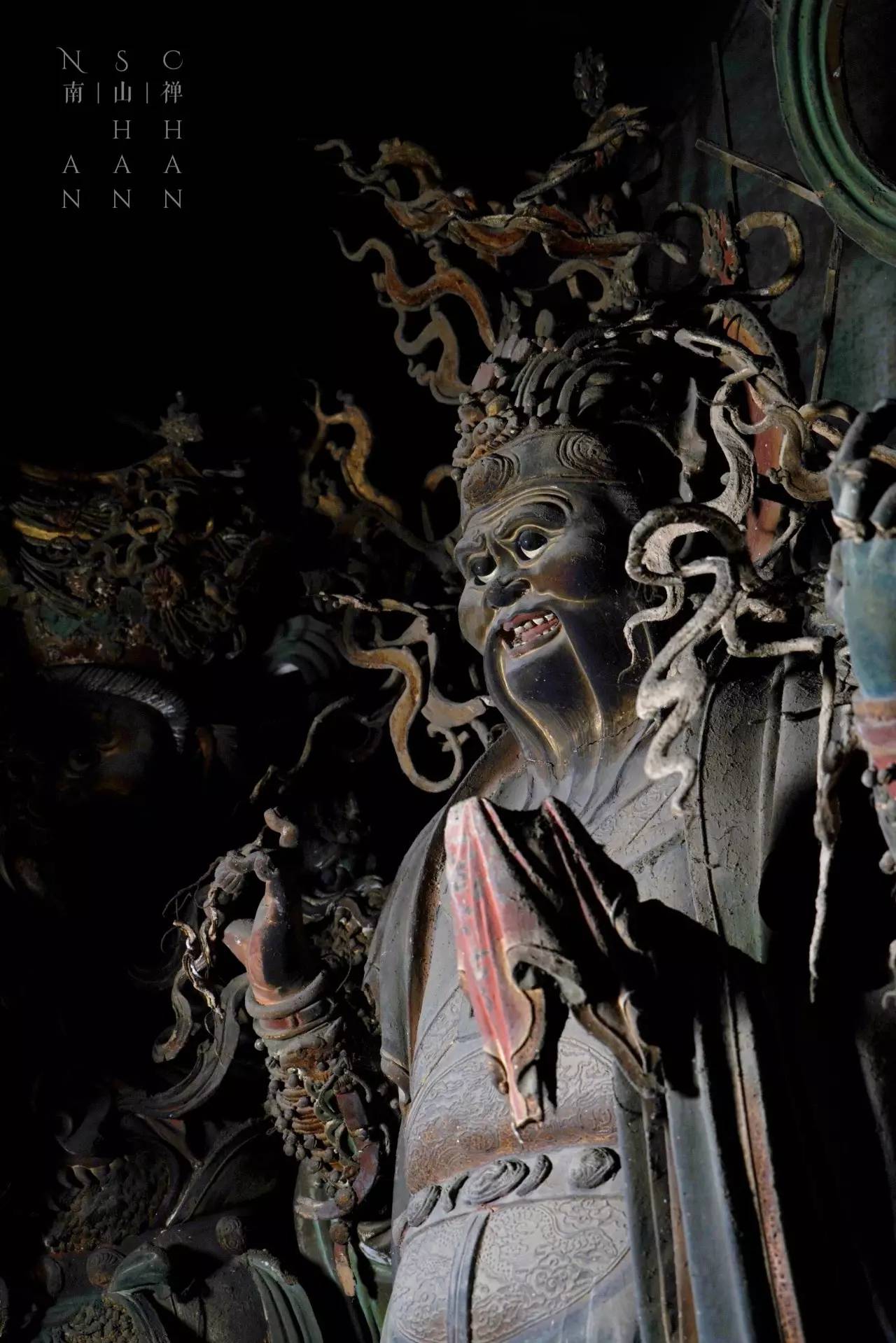 释迦牟尼佛居于殿内中央,趺坐于高高的须弥座上,背光悬塑,金碧辉煌,佛脸部的金箔被无知者刮去。文殊、普贤菩萨站立于佛两旁的莲花宝座上,可惜头部遗失,损毁严重。释迦佛背后是观音菩萨,也只余残身。大殿的东、北、西侧塑二十四诸天,这些塑像比真人高大,有的眼珠突出,有的头发倒竖,有的脚趾抓地,有的铠甲护身,其造型生动奇特,形态各异,栩栩如生。