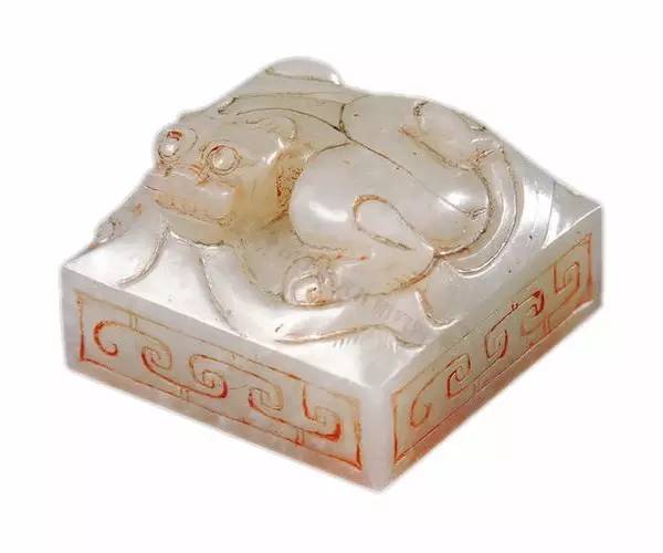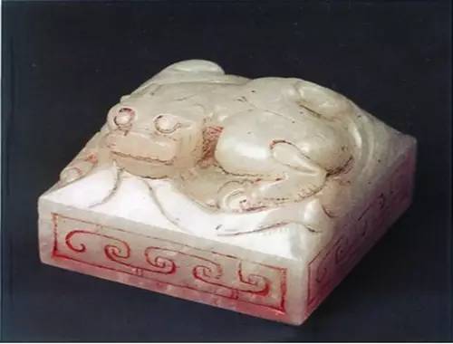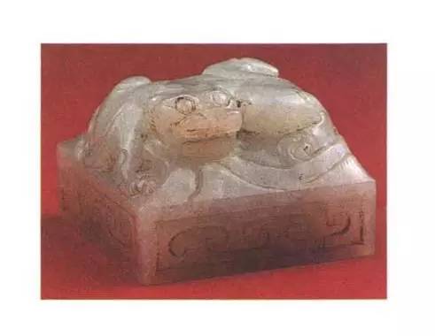 皇后之玺 高2.0厘米,边长2.8厘米,重33克,以新疆和田羊脂白玉雕成。玉色纯净无瑕,晶莹润泽。玉质坚硬致密,无任何受沁现象。玺体为正方形,钮为高浮雕的匐伏之螭虎。螭虎形象凶猛,体态矫健,四肢有力,双目圆睁,眼球圆而凸出,隆鼻方唇,张口露齿,双耳后耸,尾部藏于云纹之中,背部阴刻出一条较粗的随体摆动的曲线,六颗上齿也以阴线雕琢。螭虎腹下钻以透孔,以便穿绶系带。玺台四侧面呈平齐的长方形,并琢出长方形阴线框,其内雕琢出4个互相颠倒并勾连的卷云纹,每个云纹均以双阴竖线与边框相连。阴线槽内残留有部分朱砂。玺面阴刻篆书“皇后之玺”四字,字体结构严谨大方,笔画粗细均匀,深度一致。此枚玉玺玉质之精美,螭虎造型之生动,玺文字体之规整大气,雕琢技法之娴熟,都是罕见的。因出土地点距汉高祖和吕皇后合葬的长陵约1公里,推测为吕皇后吕雉之物,是汉代皇后玺的唯一实物资料,弥足珍贵。迄今为止,皇后之玺仍是我们发现的两汉时期等级最高、且唯一的一枚帝后玉玺,为陕西历史博物馆的八大镇馆之宝之一,并被列为国家级文物。