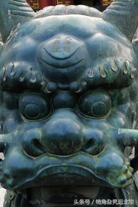 关于这只铜麒麟的制造年代很多资料上都说是乾隆年制,近日翻看《中国导游十万个为什么》一书得知在麒麟额上还铸有一个年款,为此犄角君上周末特意又去了一趟颐和园,费了半天劲用自拍杆才拍下了麒麟额头的大清乾隆年造这几个字。