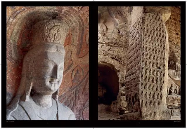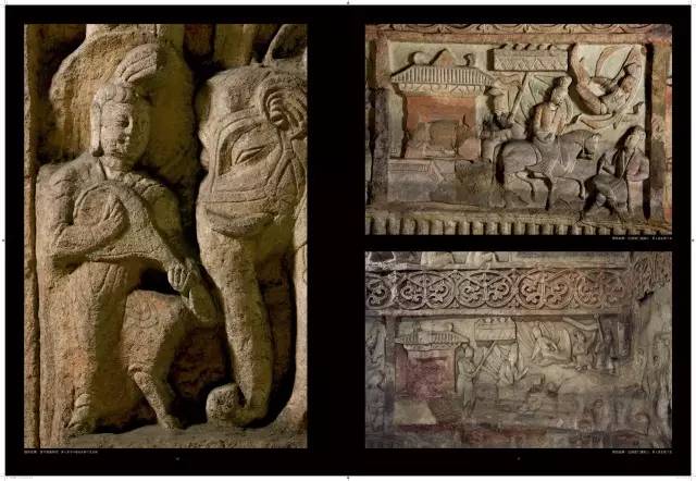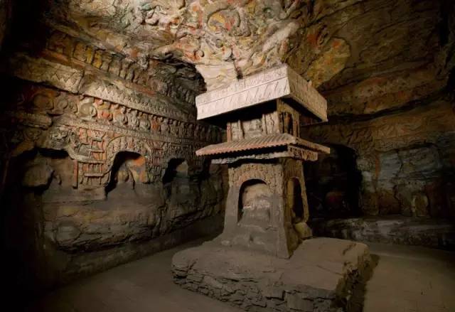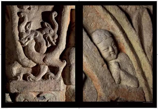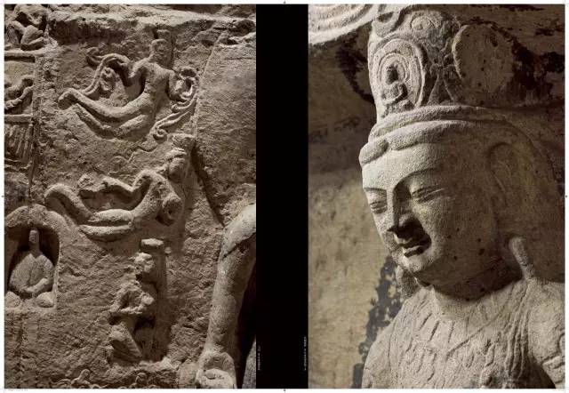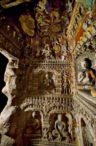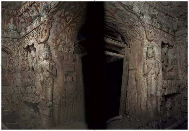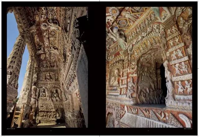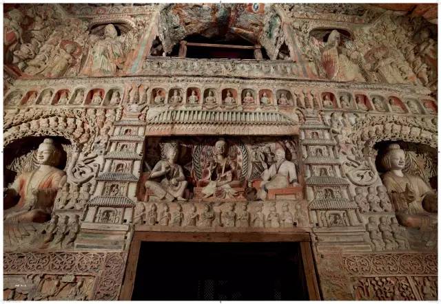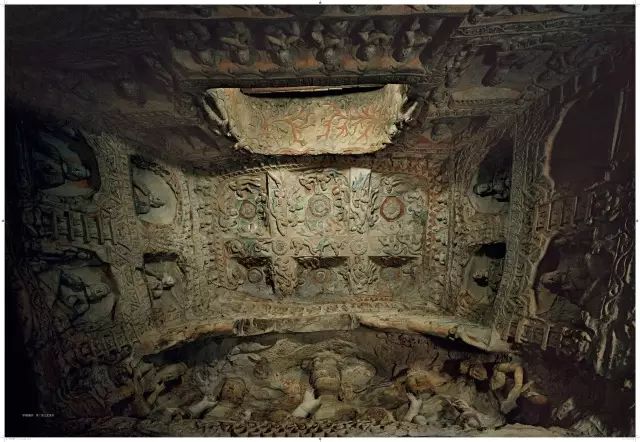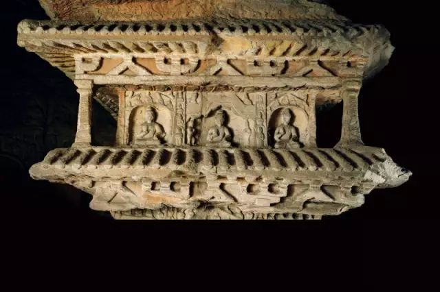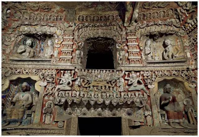 平面方形洞窟的大量出现,较早期穹庐型洞窟而言,雕刻面积大幅度增加,雕刻内容与形式也变得复杂起来。洞窟的顶部,多采用平棋藻井式雕刻。壁面的雕刻,采取了上下重层、左右分段的方式。