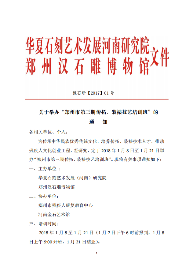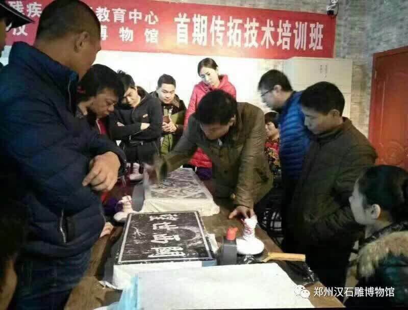 为传承中华民族优秀的传统文化,培养传拓、装裱技艺人才,助推残疾人文化创业工程,由华夏石刻艺术发展(河南)研究院和郑州汉石雕博物馆主办的“郑州市第三期传拓、装裱技艺培训班”将于2018年1月8日开班。本次培训班培训时间15天,1月8日起至1月21日结束。将采用理论与实践结合的教学方法,以平面拓、浮雕拓为主,彩色拓、全型拓为辅,对参训学员进行系统和科学的传拓技艺培训,使学员掌握各种传拓技法。 同时,为使学员达到即能拓、又能裱的目的,进一步提高传拓效果,培训班还传授传统手工托心、托绫、方心、镶边、覆背、打浆糊等专业技法。期间,还将组织参训学员到郑州汉石雕博物馆和巩义柏沟岭“天然山庄”学习、实践 ,感受古代石刻艺术魅力,并接受我国当代老艺术家陈天然先生指教。