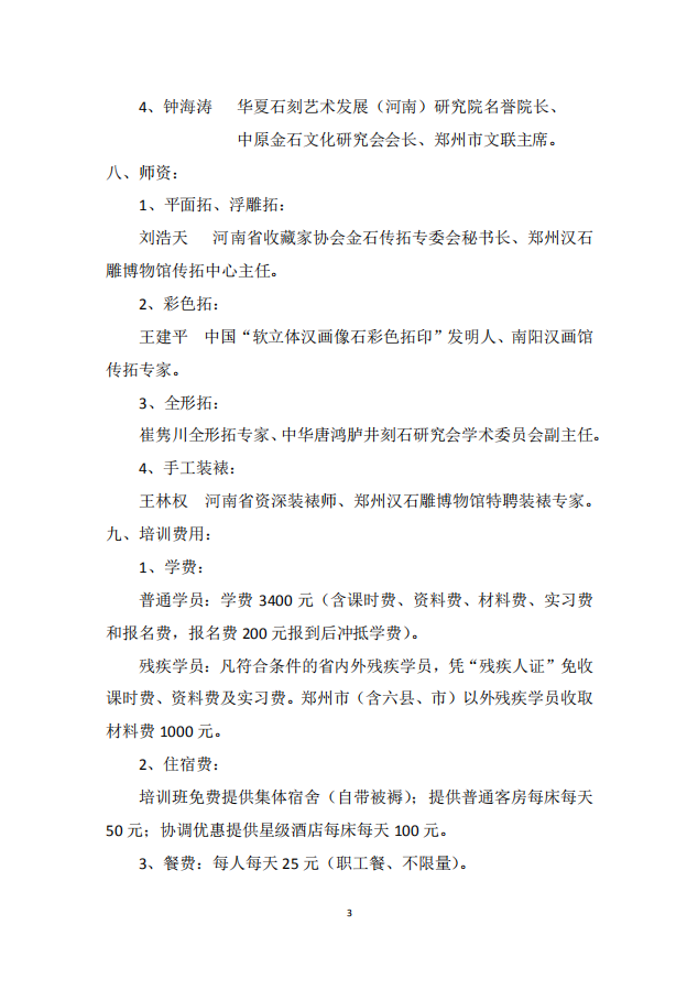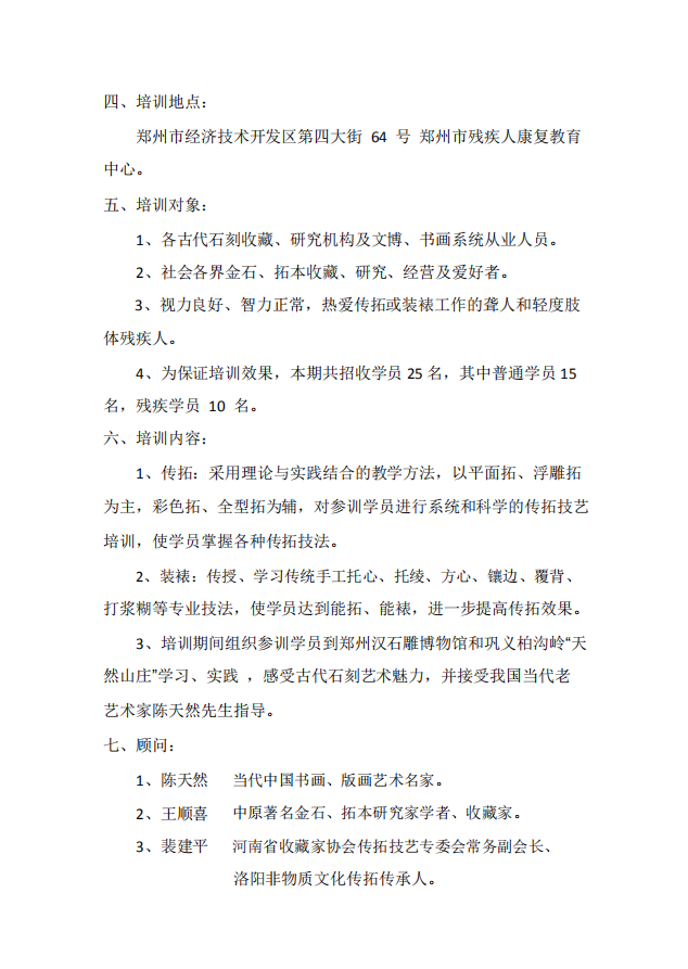 热诚欢迎各古代石刻收藏、研究机构及文博、书画系统从业人员,社会各界金石拓本收藏、研究、经营、爱好者报名参加培训。 凡视力良好、智力正常,热爱传拓或装裱工作的聋人和轻度肢体残疾人 也可报名参加学习。 本期培训班拟招收学员25名,其中残疾人学员10名。为支持残疾人文化创业,对郑州市辖区残疾学员免收培训费用。