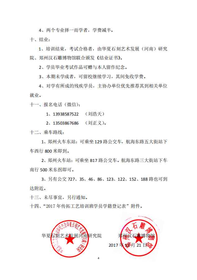 培训结束,考试合格者,由华夏石刻艺术发展(河南)研究院、郑州汉石雕博物馆联合颁发结业证书;本期未学成者,可留校继续学习,其间免收学费;对学有所成的残疾学员,主协办单位优先推荐其到相关单位就业。