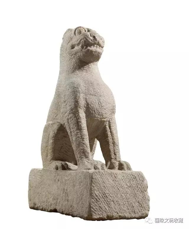 石兽白石材质,高一百三十五公分,双脚镂雕,前肢直立蹲坐与石基之上,面相凶猛,口露尖牙,须发以短促的线条刻画,全身亦布满开凿的石纹,刀法概括而生动,透出造像者的高超技艺。石兽的身姿修长,昂首扩胸,气质高雅,且历经千百年流传,品相之完好,实在难得。