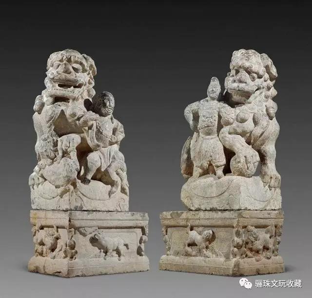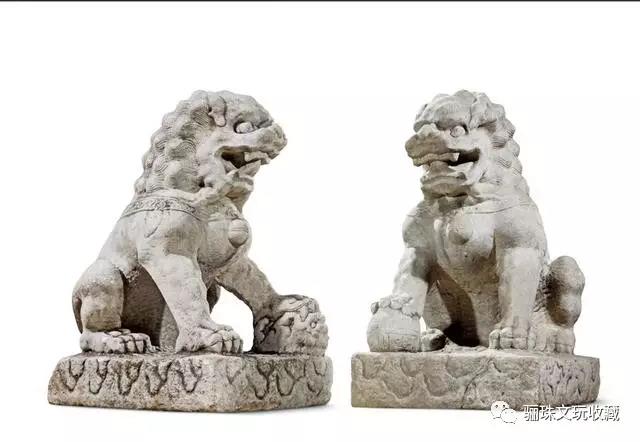 石狮自古是被佛教推崇的至尊高贵的灵兽,石狮雕刻艺术自东汉时期传入我国,在唐代达到顶峰。由于其威武雄壮,多用于看守门户,镇宅,护身,寓意吉祥平安。至明代,石狮造型走向成熟和定式。此对石狮造型蹲坐式,身姿威严,体态健硕有力。石狮坐于长方形云座之上。雌狮左足抚幼狮,雄狮右足踏绣球。两个石狮头部微微前倾,跨数百年守望依旧。丰厚卷曲的鬃毛,概括有致。整体风格大气、自然,格外写实的雕刻手法,加之岁月沁润出的古雅色调,内敛而厚重,不愧为明代遗留至今的佳品。