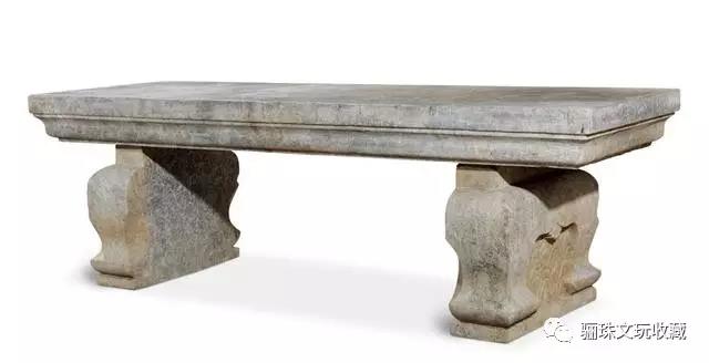 拍品体型硕大,长两百五十一公分,高八十一公分,选用青石材质。桌面光泽平整,面板下方内收与双足连接,底座做成壶门形,壶门内刻涯石纹,造型质朴,包浆自然。古朴的外形,不落俗套的风格彰显了古人对于园林艺术的高雅追求。