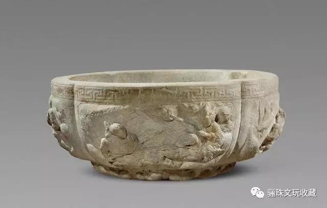 盆是大雅之物,是文化和艺术的集大成者。此件清代白石满工高浮雕石盆,形制古朴端庄,石质细腻,雕工精湛。此盆周身雕刻人物纹,盆身分四瓣,每瓣所刻人物构成不同场景,人物的雕刻概括且生动。此盆深浅浮雕并用,雕工繁复却不失典雅,实为石盆艺术中不可多得之精品。