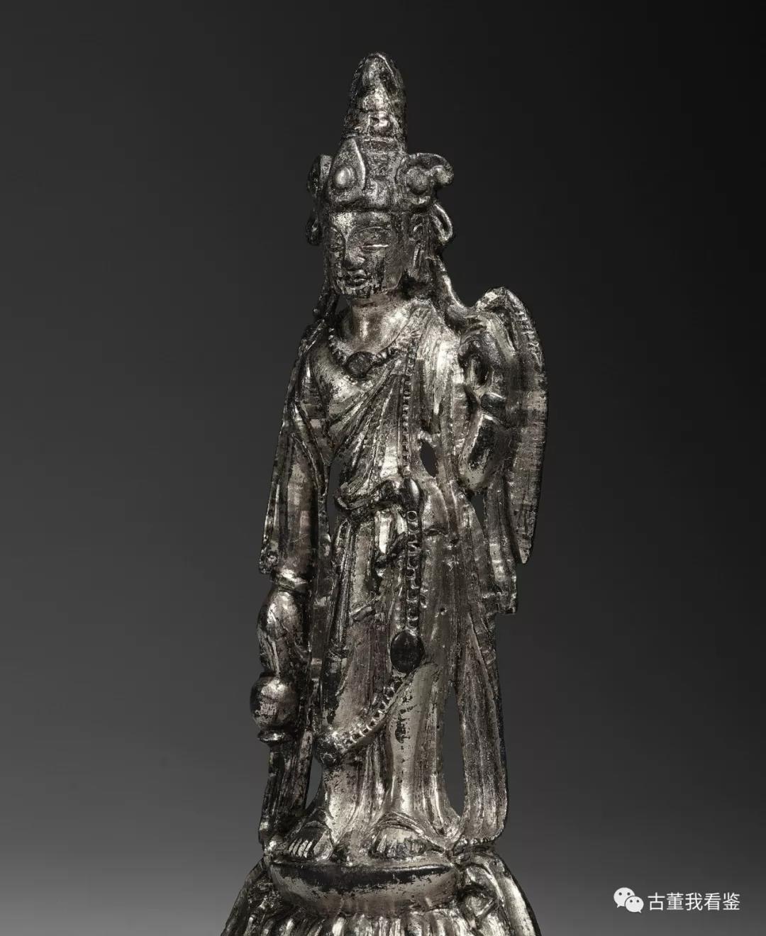 此尊立像,左手持淨瓶,右手缺失,或曾持楊柳枝,皆乃觀音菩薩所特有。比一石灰石例,稍小,依銘文知,造於保定三年(公元563年),左手亦持淨瓶,錄松原三郎,出處同上,圖版350a及b,同錄一像,斷代不詳,圖版350c。有三尊石灰石菩薩像,身形魁偉,雕工精細,亦傳為北周末至隋初所造,風格均與此尊可比;其一,賽克勒雅蓄,現存哥倫比亞大學,紐約,編號S3342;其二,藏大都會藝術博物館,紐約,載 Denise Patry Leidy 及 Donna Strahan,《Wisdom Embodied. Chinese Buddhist and Daoist Sculpture in the Metropolitan Museum of Art》,紐約,2010年,頁173,圖版A16;其三,貯明尼亞波利斯美術館,明尼亞波利斯,刊《海外遺珍:佛像》,台北,1986年,圖版60。