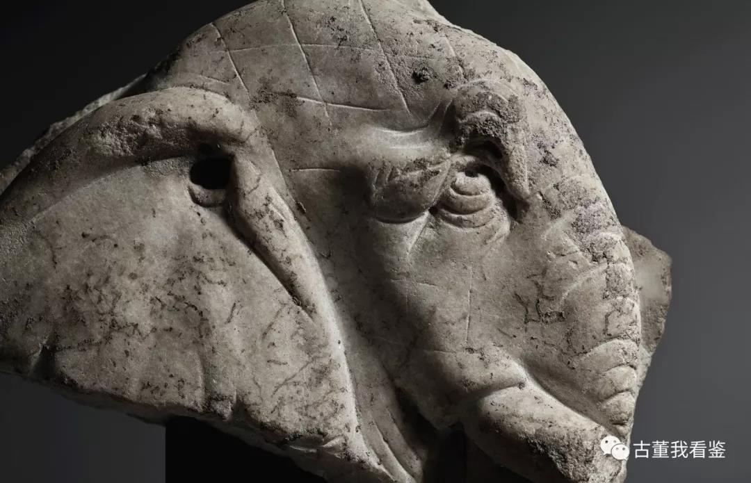 中國藝匠所塑造的大象形象,象首多飾T形束帶,可見前述例作。本像象首則飾對角十字交叉頭罩,與部份犍陀羅作例相近,包括一片岩例, 現存於大阪正木美術館,斷代二或三世紀,圖見《「墨の彩」:正木美術館開館30周年記念展図録》,根津美術館,東京,1998年,編號82, 售於紐約蘇富比2012年9月11日,編號104。正木美術館所藏作例刻畫頭罩覆蓋象面,或更接近實用騎具形像,而本品則僅遮蓋象首頭頂,更 偏裝飾性,明顯具備漢象造型傳統,但亦可見其受了外來石雕風格影響。