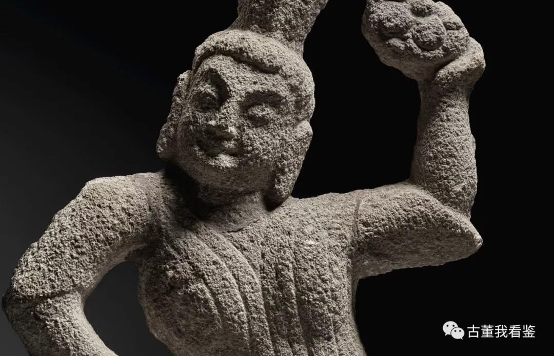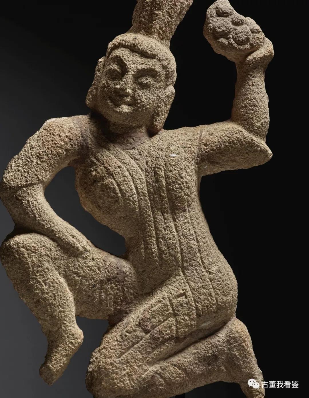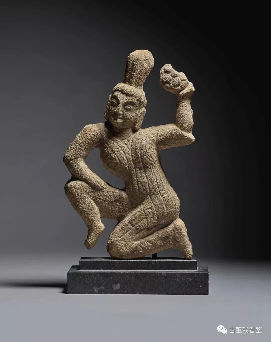 本像姿態動感豐富,結高髮髻,應屬飛天造型。飛天出自印度文化,屬於仙女,北魏期間,飛天形像常見於佛壇、三尊像及石窟,營造淨土 曼妙氣氛。飛天多為仙女形象,起舞奏樂,伴於諸佛菩薩四周。蹲跪飛天造型並不常見,唯可比較一石灰石浮雕例,飛天姿態與本品相近, 出自戴潤齋收藏,售於香港蘇富比1997年4月29日,編號713,並載於《般若寶相:靜雅堂藏中國佛像藝術》,台北,2016年,圖版5;另一 例見於河南省洛陽附近龍門石窟賓陽中洞後壁,圖見於《中國美術全集.雕塑編.11.龍門石窟雕刻》,上海,1988年,圖版40。