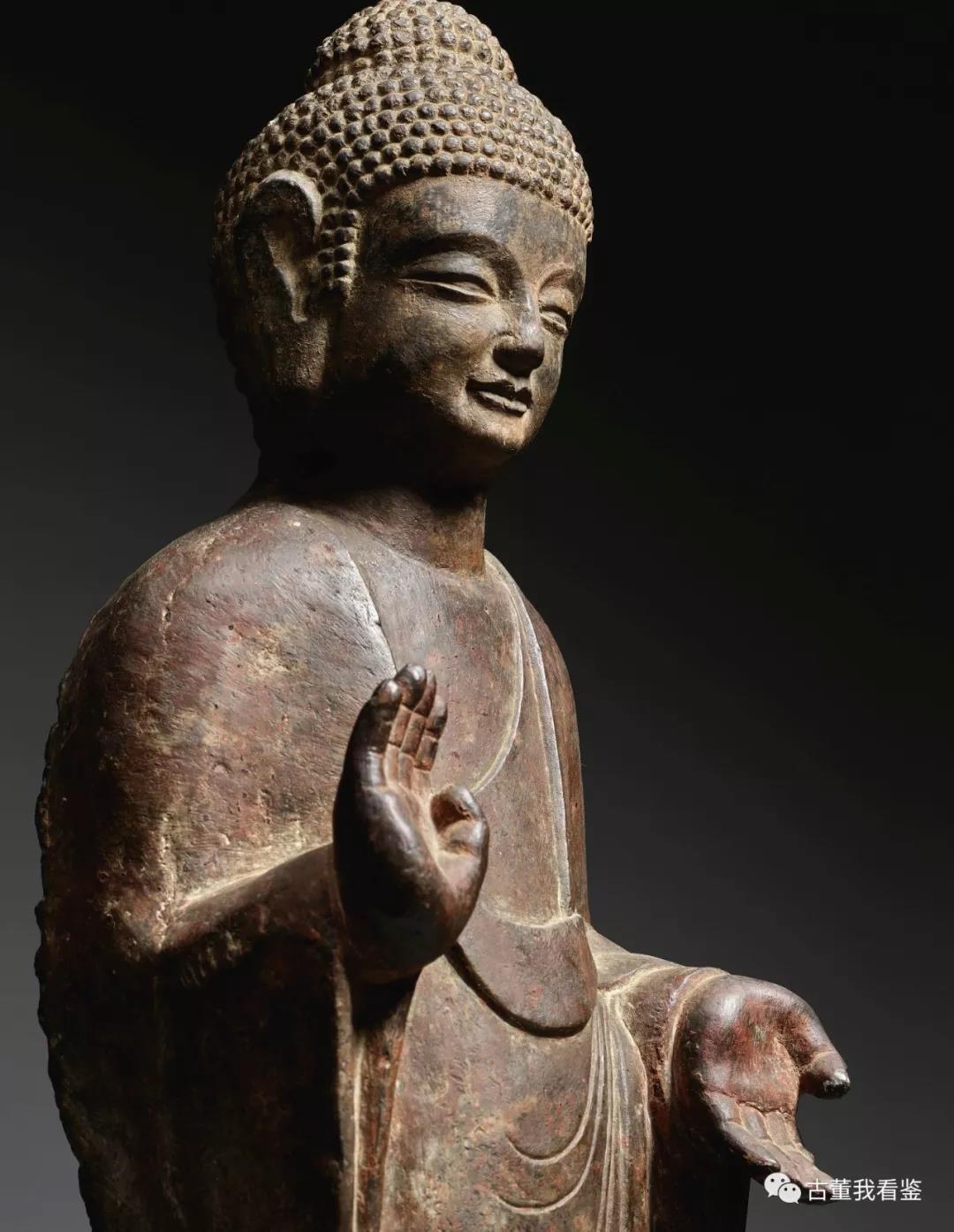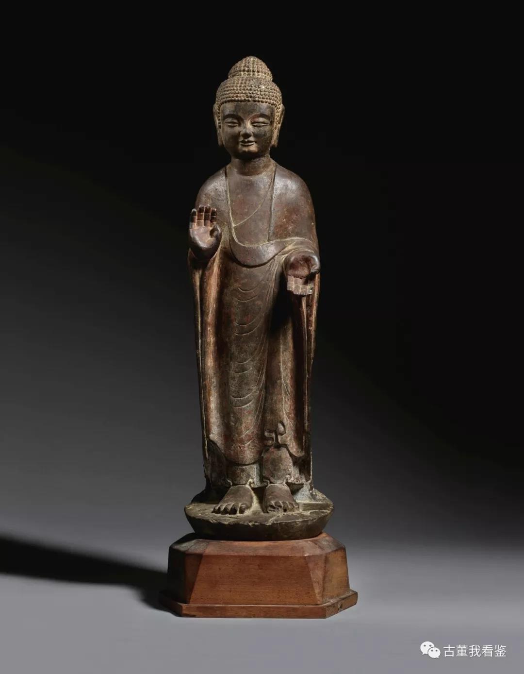 北魏分崩離析後,北齊、北周兩朝對立東西,各自為政,時局變遷對於中國佛教藝術之影響可謂深遠。加之印度貴霜王朝時期犍陀羅及秣菟羅兩地造像藝術隨絲綢之路傳至中國,極大變改本土造像表現形式,此番變化觀龍門、雲岡石窟造像便可了然。多笈王朝時期佛造像風格備投北齊皇室所好,講究輕紗透體,衣褶瀲灩如波,以突顯形體之曼妙,故而北齊佛造像風格亦隨之遞演,推陳出新。北周雖亦受影響,然皇室更鍾情於碩健之感,追求面容圓潤,五官飽滿之開臉,恰如本品。可比一銅像例,尺寸較小,售於香港佳士得2015年12月2日,編號2901。