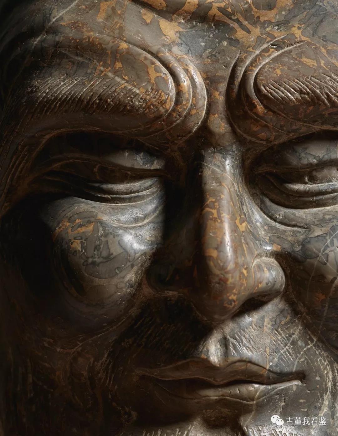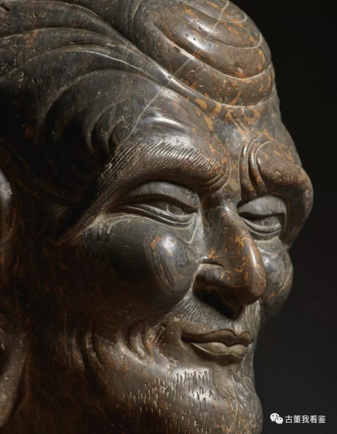 本例羅漢首像精雕而就,細節處面面俱到,所定格之神韻靈妙逼真,栩栩如生,加之其尺寸碩然,著實叫人過目難忘、印象深刻。整體雕塑打磨圓潤,起伏自然、錯綜曲折之弧面活現頭骨輪廓,額骨見數道陰刻紋,線條流暢卻深入三分,使整體造型愈加深刻。前額、眼週及嘴角皺紋簡潔利落、絲縷分明,精準素描出年長智者面容特徵,更強化雕塑立體視效。羅漢雙眼微闔,低眸而視似冥思入定,威而不怒;嘴角略揚,笑容平和慈悲,傳達悲天憫人之情狀,是為羅漢首像之典範。