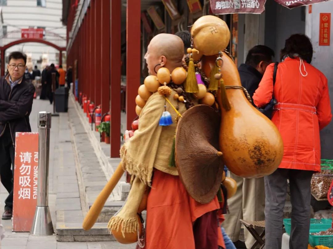 一个亮眼的光头,手拿一根葫芦大棍,背上背着个大葫芦,看着有行走江湖的大侠风