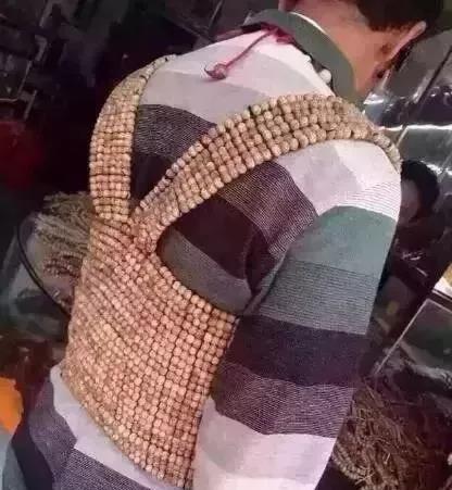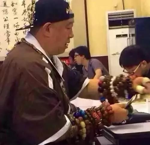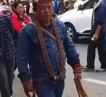 可是佩戴着的文玩,就很辣眼睛了,脖子戴着的一大串疑似蜜蜡的手串可真大,可惜的