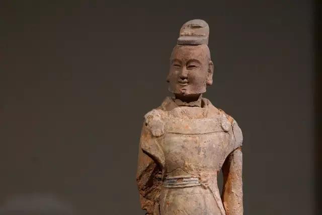 这件好似贵族的男俑年轻貌美,头戴小冠,广袖束腰、褶衣缚裤、裲裆铠甲,均是当时胡人新潮服饰,汉