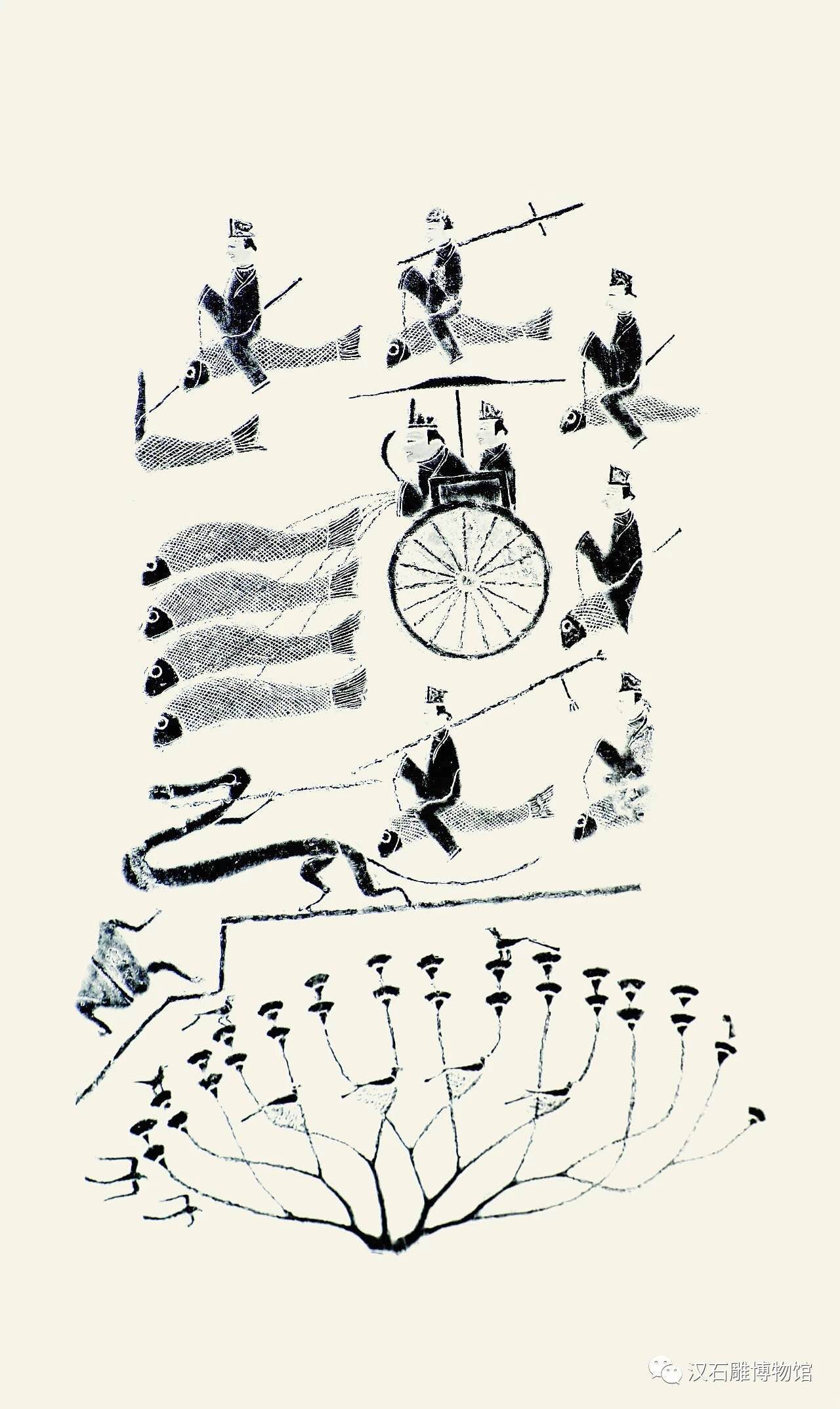车上高张华盖,御者双手挽缰,河伯则端坐于车上; 车架上下右各有骑鱼卫士7名指引护卫,左下 龙、蟾为河伯开道,浩浩荡荡,