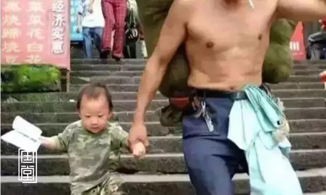 上了年纪的父亲说:“我累了,不想走了。”“来,我抱你。”儿子一把抱起父亲,父亲就趴在他肩膀上,像孩子般开心地笑着。