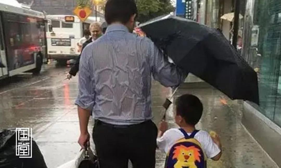 雨天,下了班的爸爸接放学的孩子回家,自己湿透不要紧,孩子安好便是晴天。