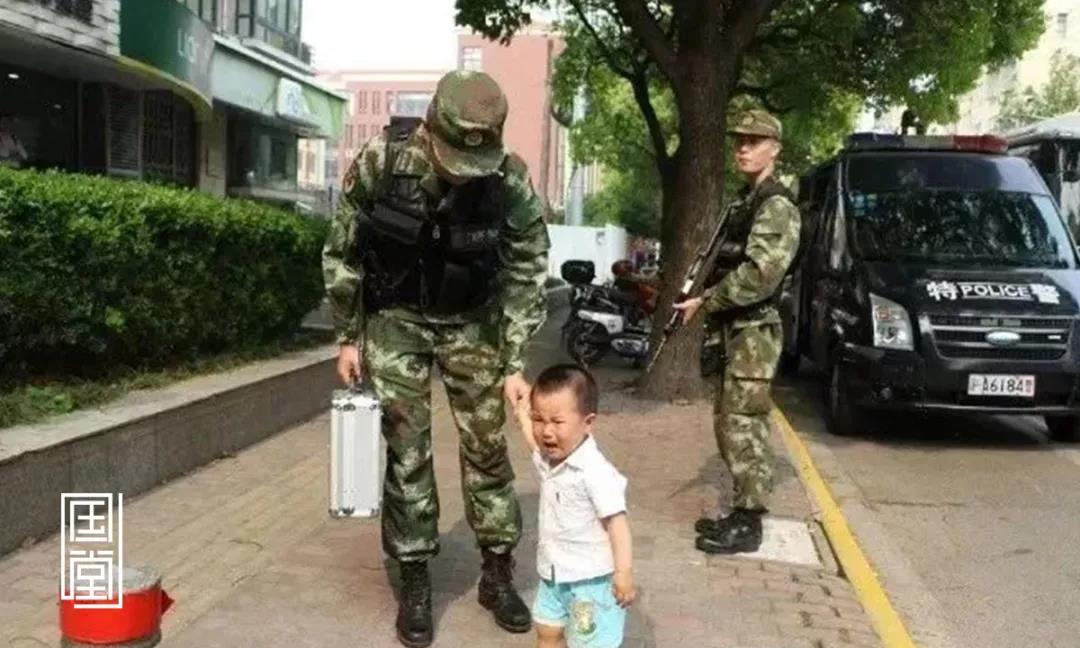 两岁宝宝路遇执勤的武警爸爸,紧紧拽住爸爸的手不放,