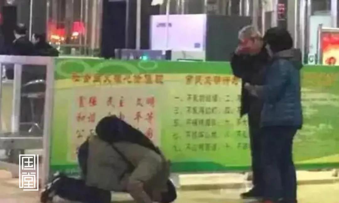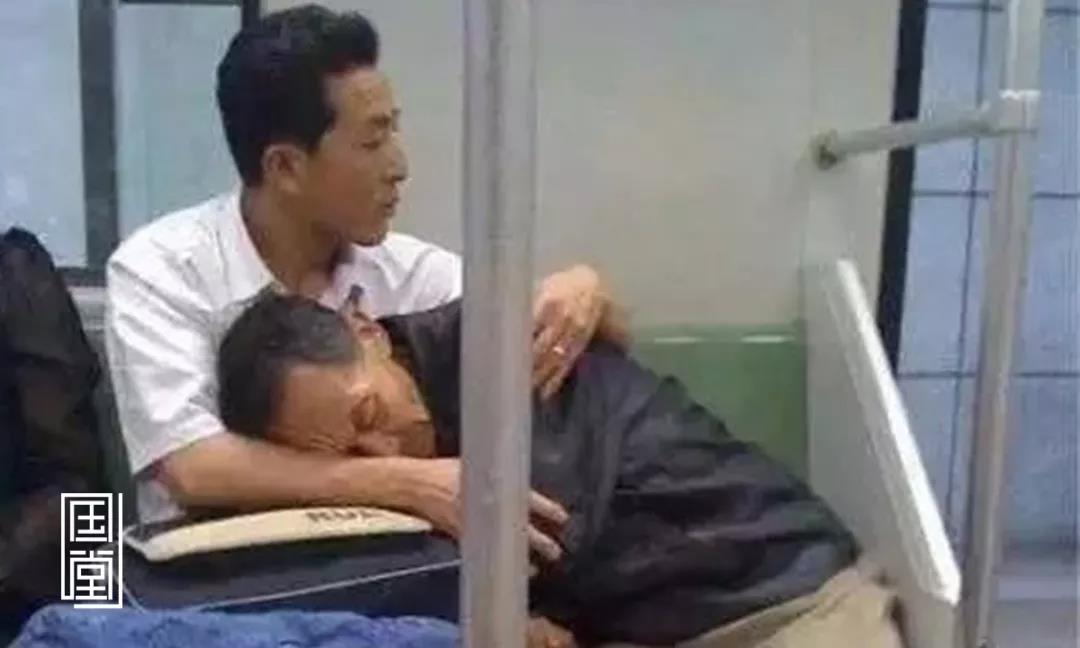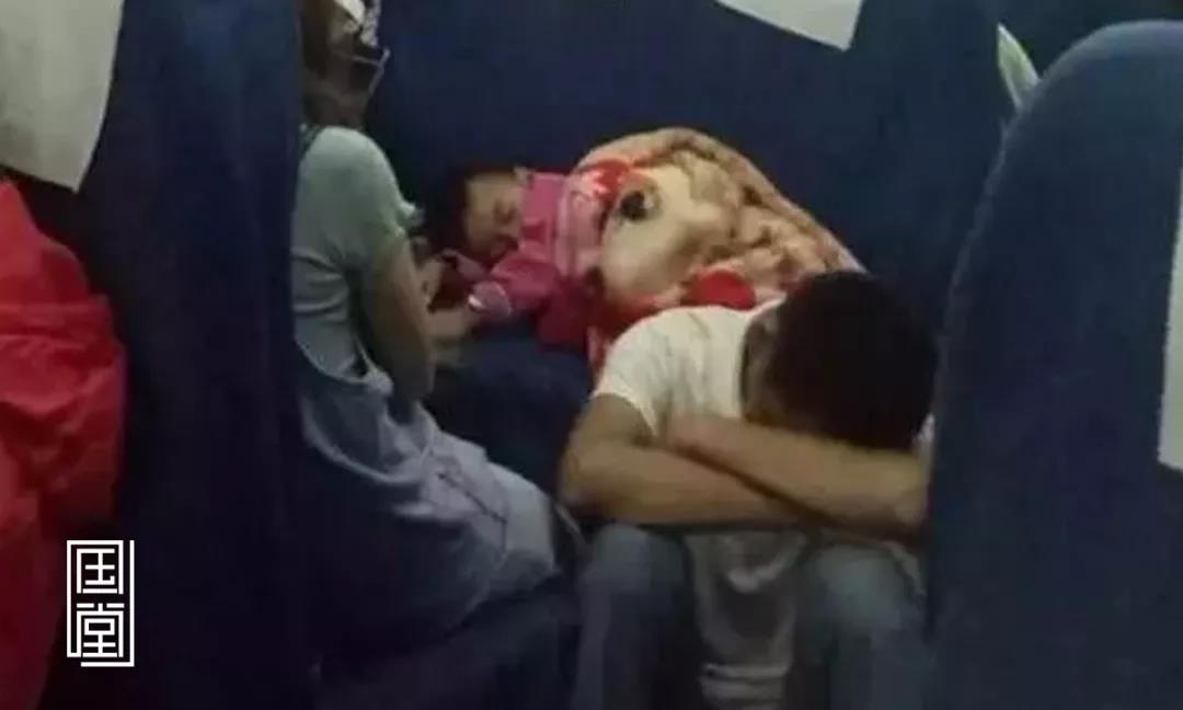 火车上,为了让儿子睡得舒服些,父亲干脆坐在地上休息。